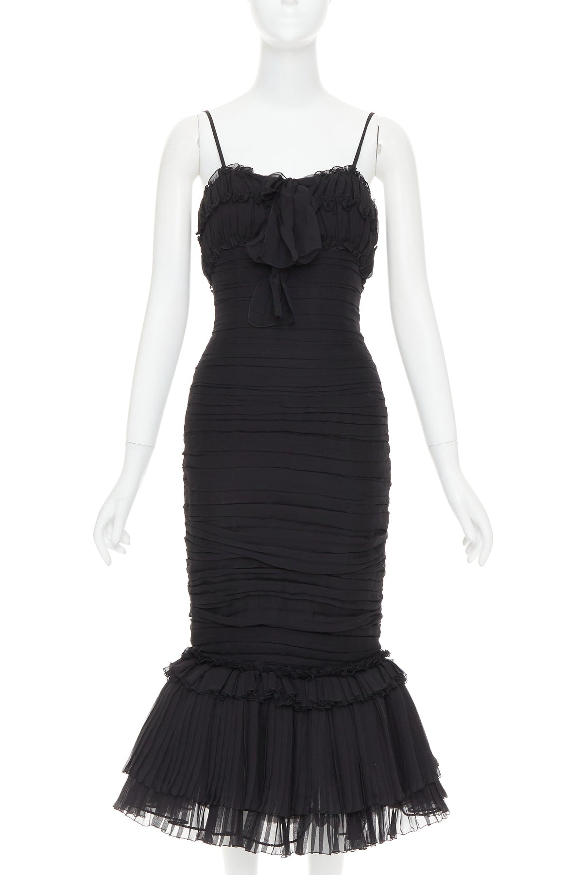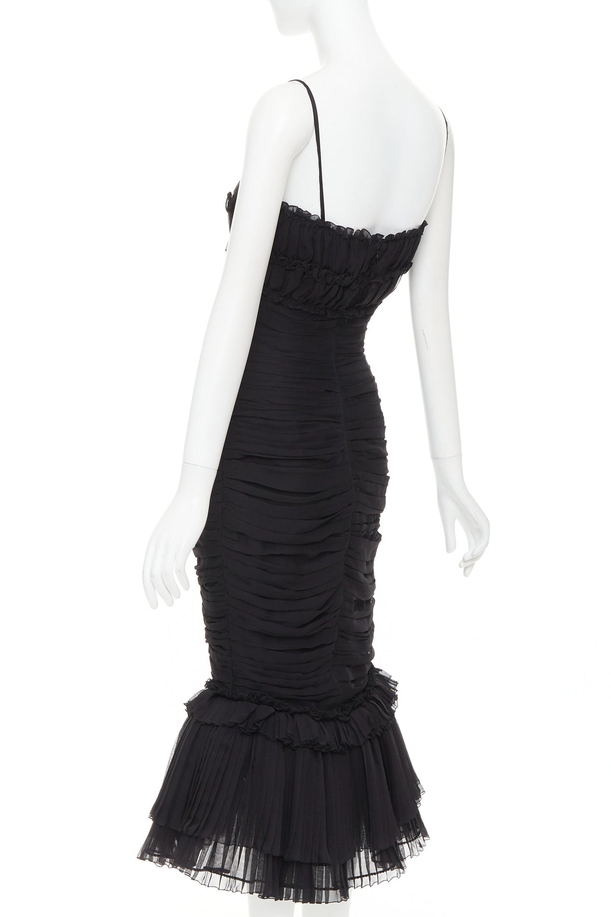 Extra Details: Boned corset construction. A sweetheart neckline, adjustable spaghetti straps, an internal bustier for shape, and a fitted silhouette that flares into a ruffled mermaid hem. Tonal black crystal embellishment along hemline. .