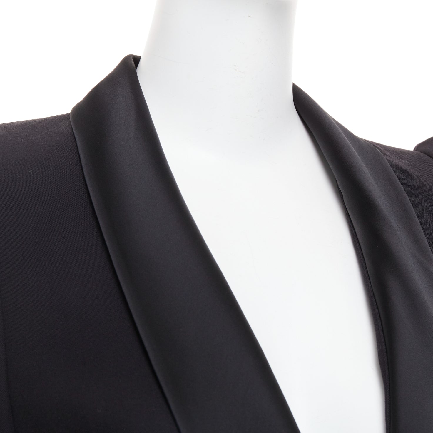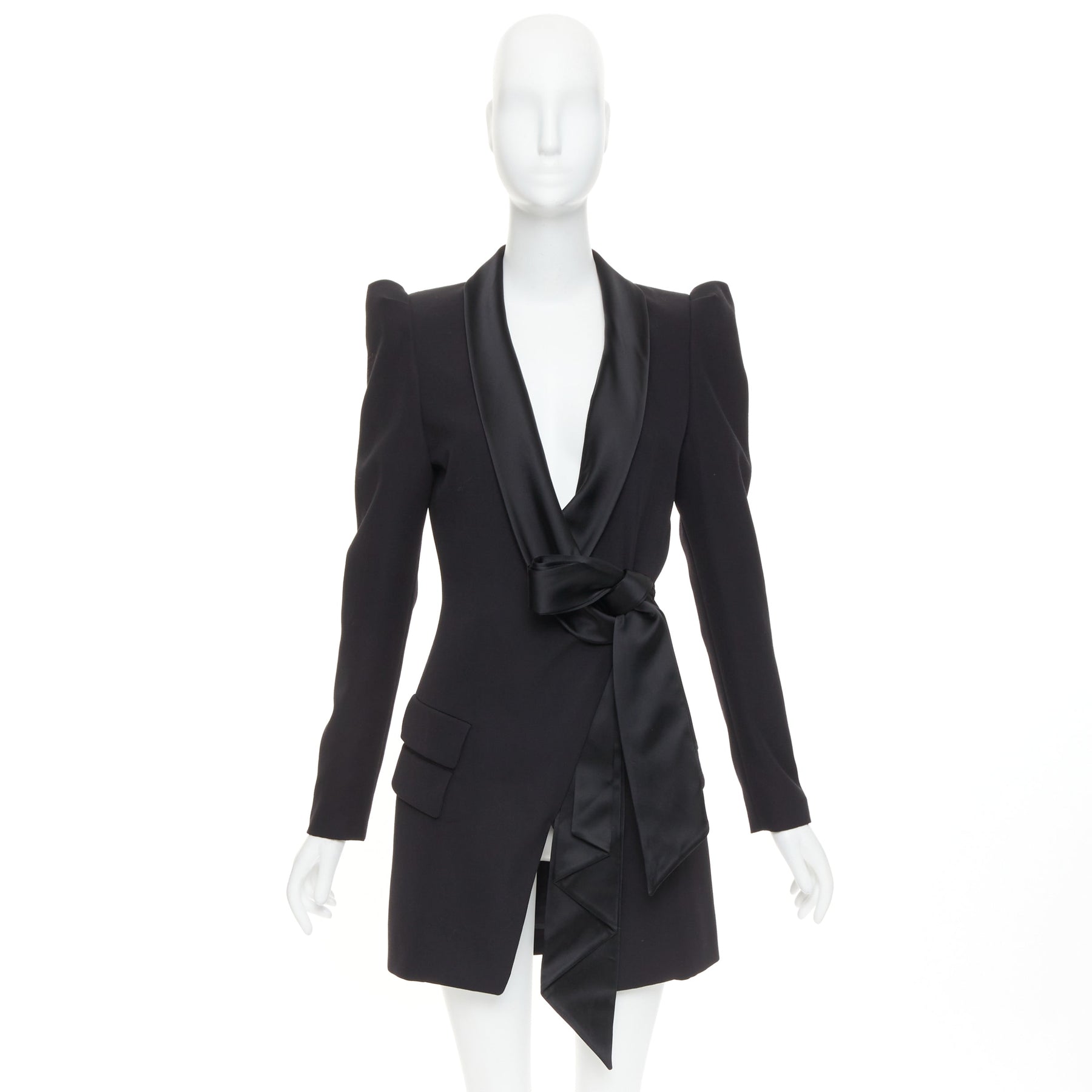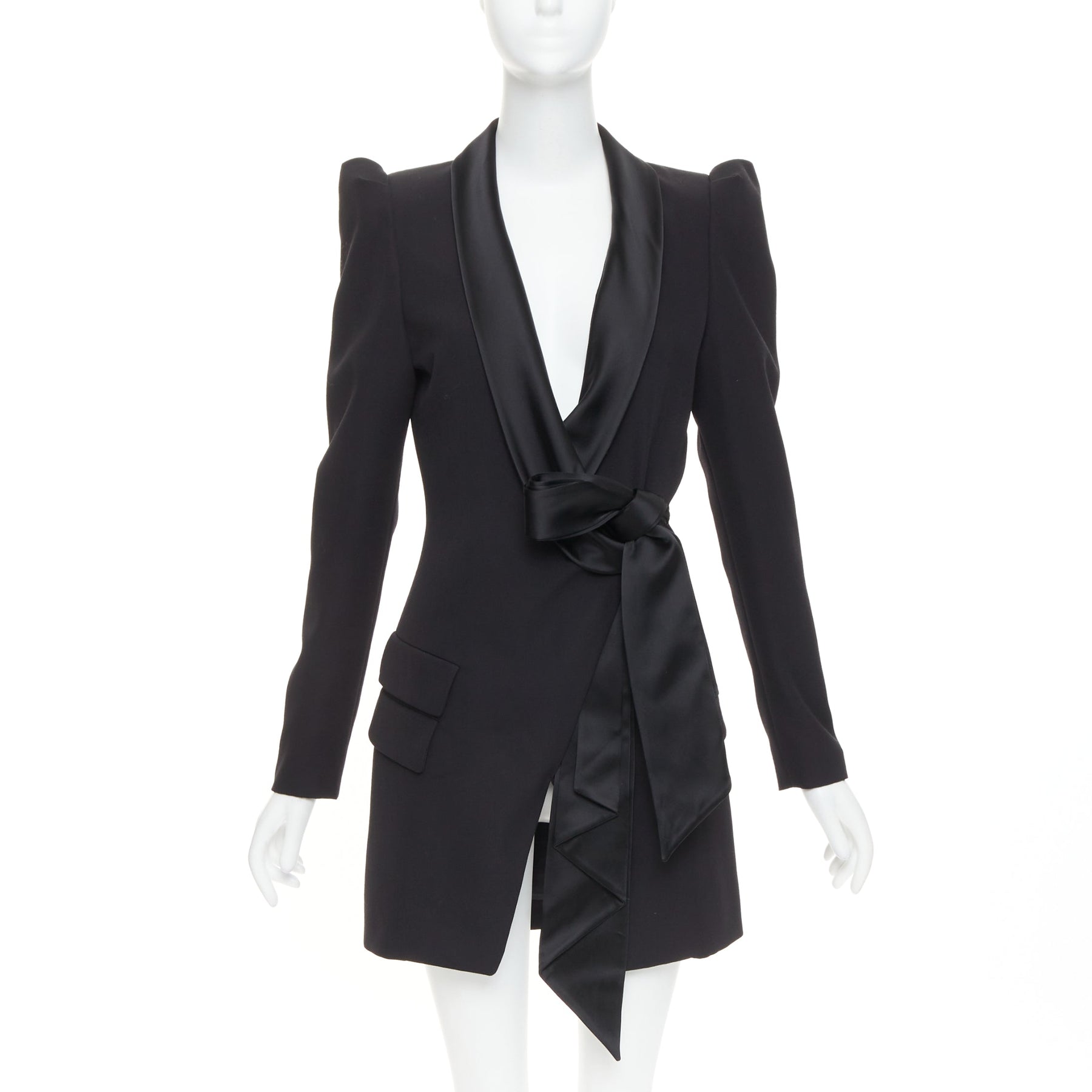 Extra Details: Tuxedo blazer dress by Alexandre Vauthier. Dramatic puff pagoda shoulders, deep plunging neckline with satin shawl lapels, and a sash that ties at the waist to create an asymmetric, mini-dress silhouette. Snap button and self tie.