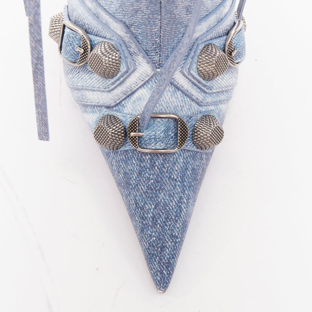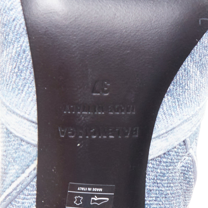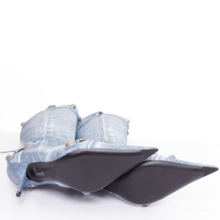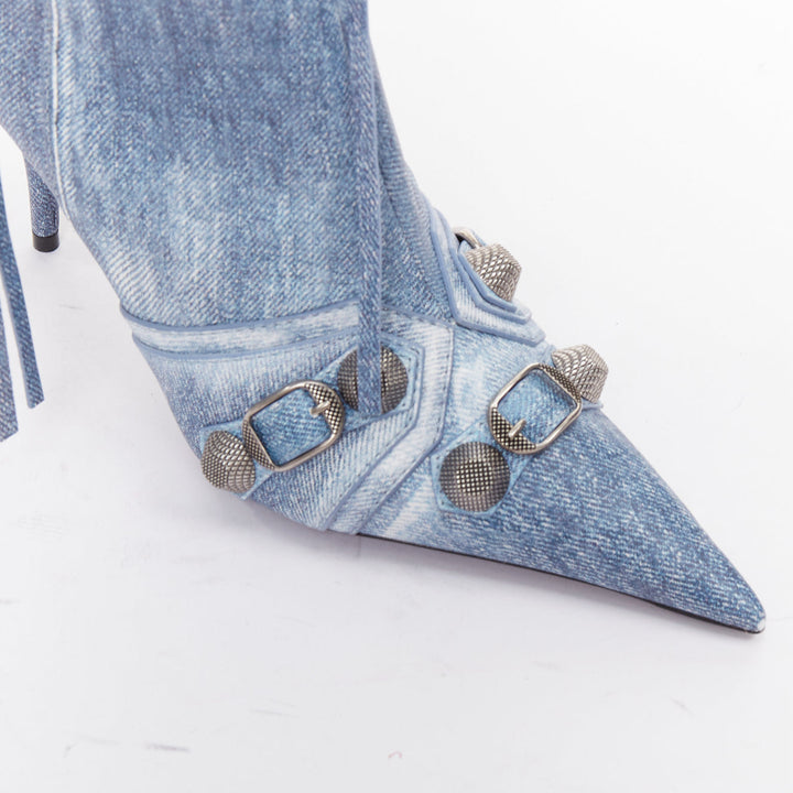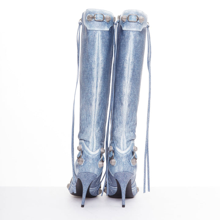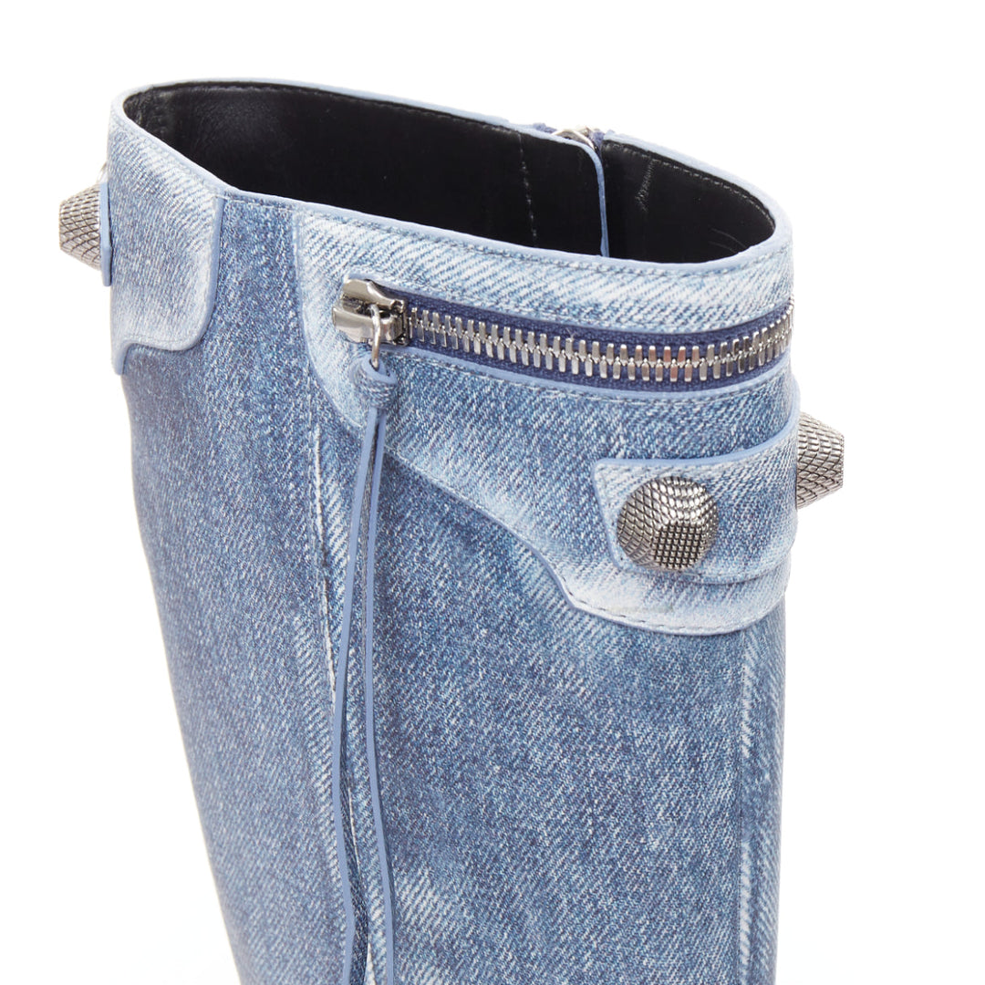 BALENCIAGA Cagole blue denim printed leather silver stud moto tall boots EU37