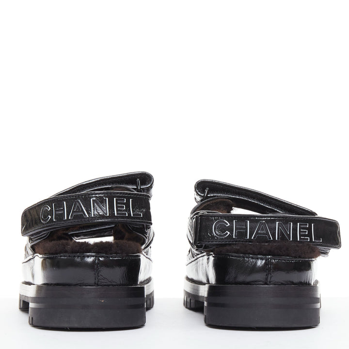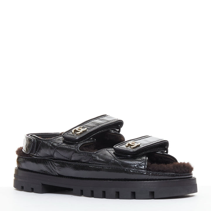 CHANEL 2023 black laminated lambskin shearling crystal CC dad sandals EU37