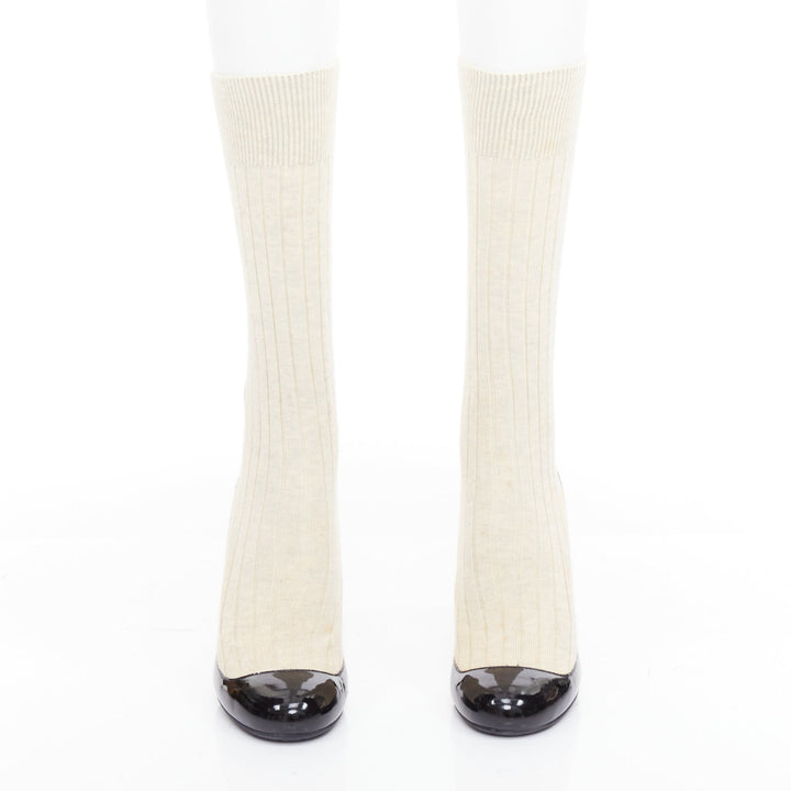 CHANEL Karl Lagerfeld 14P Runway cream black patent sock boots EU37.5