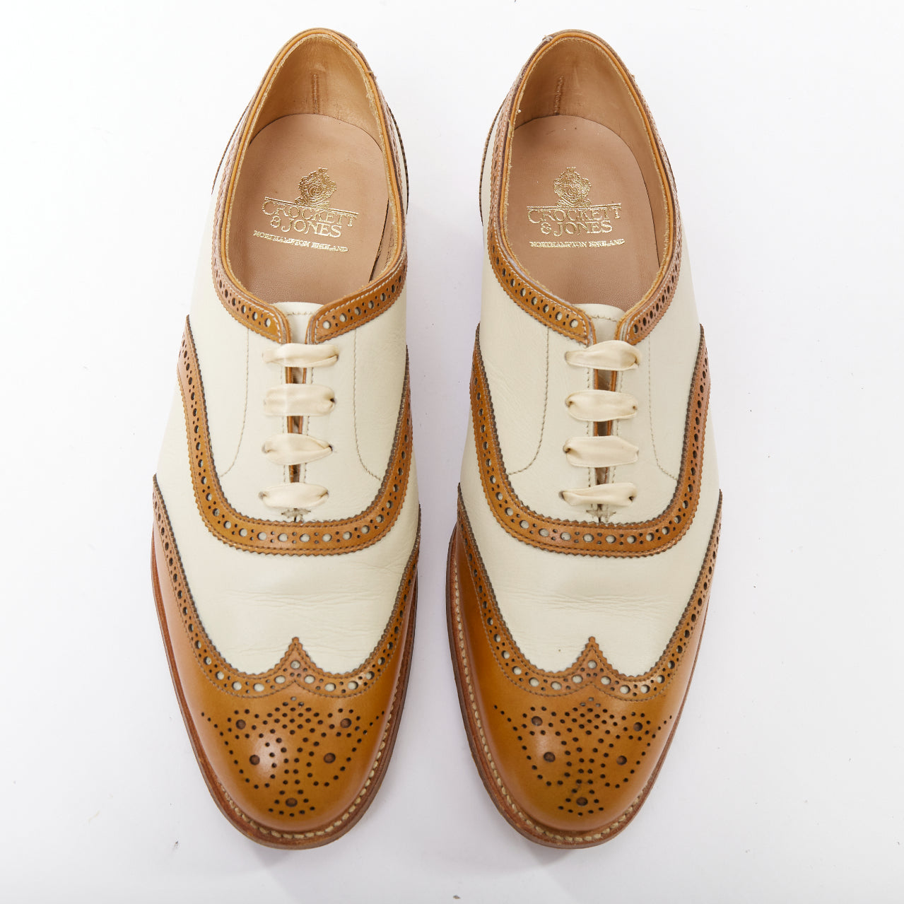 Extra Details: Alice, a full brogue, wing tip oxford shoe with punched medallion on the toe. Made from the finest tan and ivory calf leather combination with single leather soles.