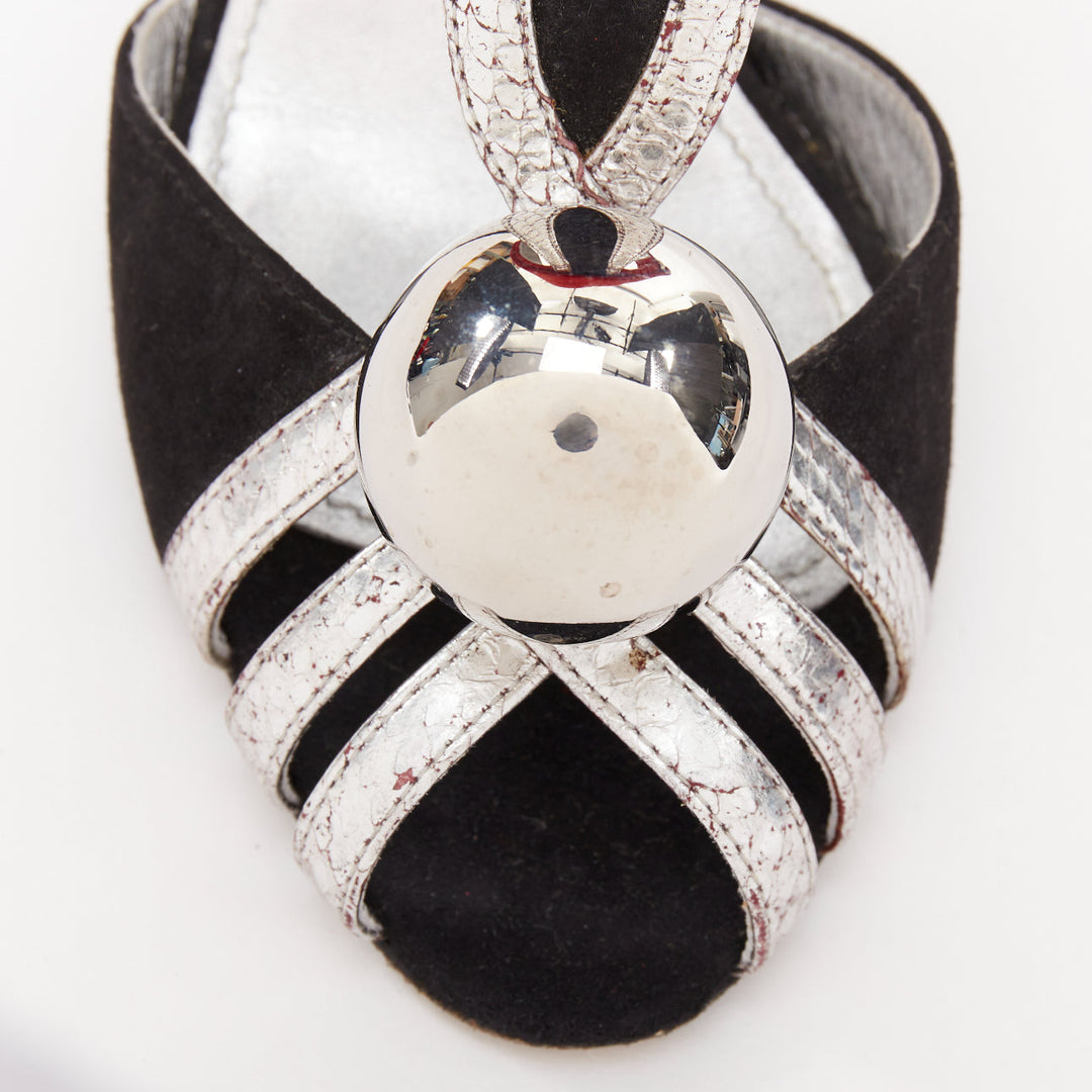 Condition: Fair, this item was pre-owned and is in fair condition. Please refer to image gallery for thorough condition check. Minor scuffing on black suede leather, cracking of leather on the right foot at the silver leather section, micro stains on hardware, and minor chipped paint on the left heel.
