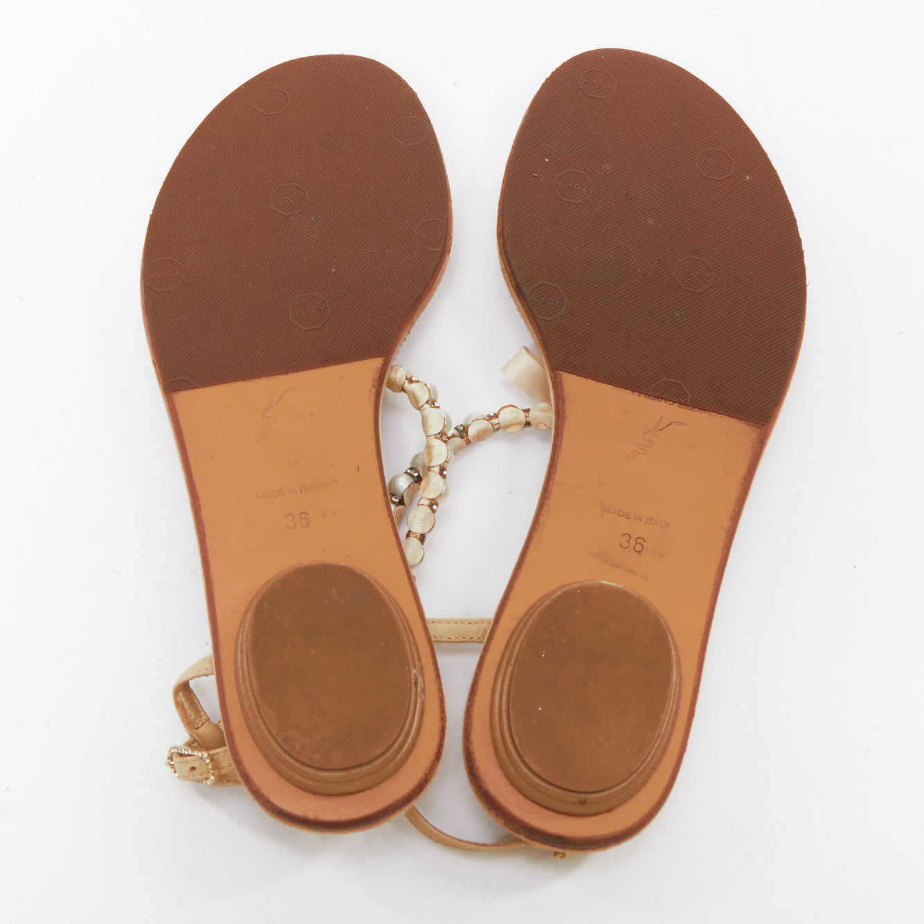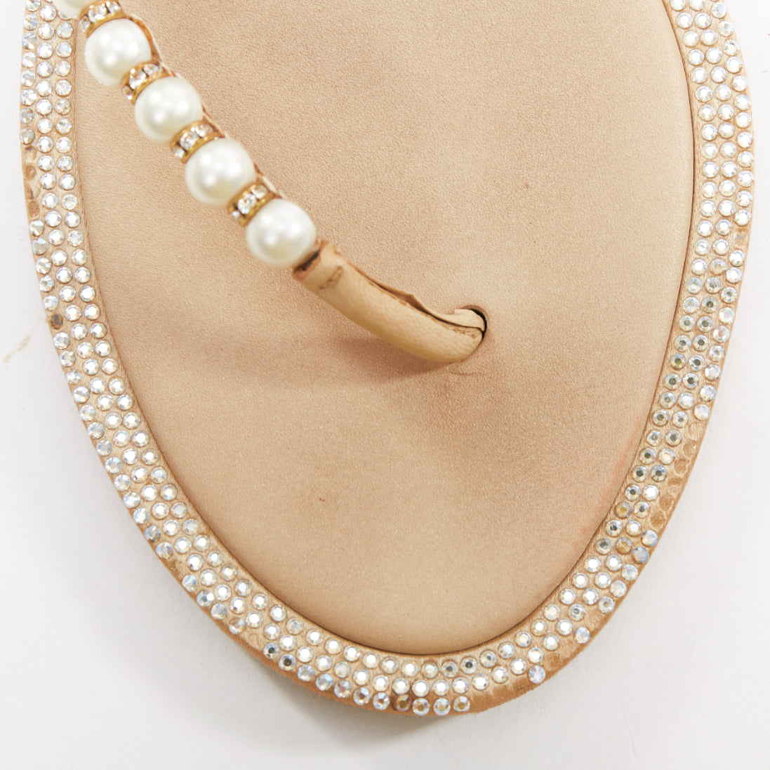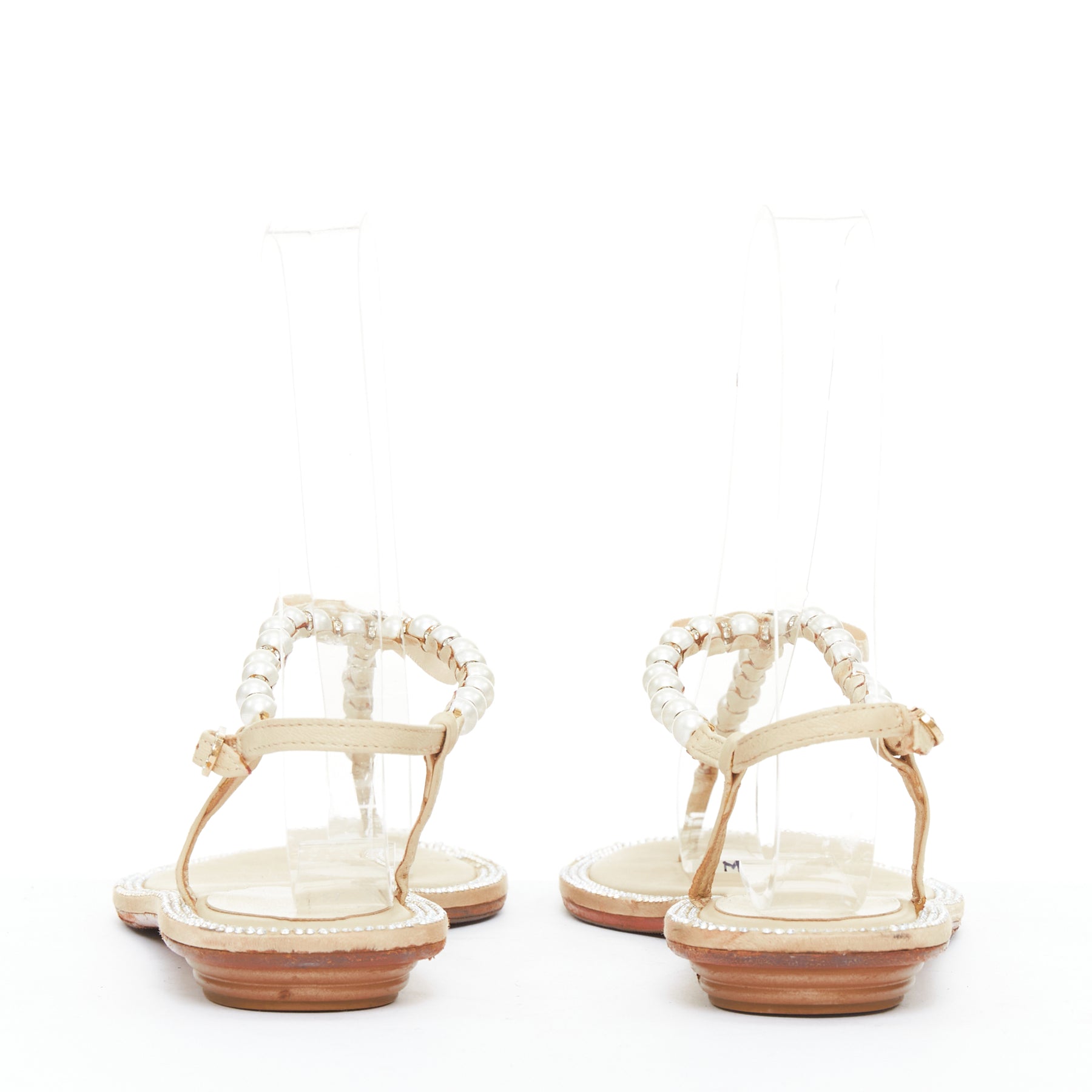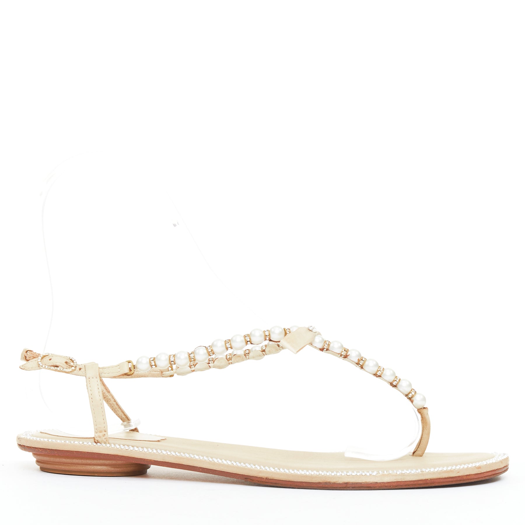 RENE CAOVILLA cream bow faux pearl tstrap strass trim flat sandals EU36
