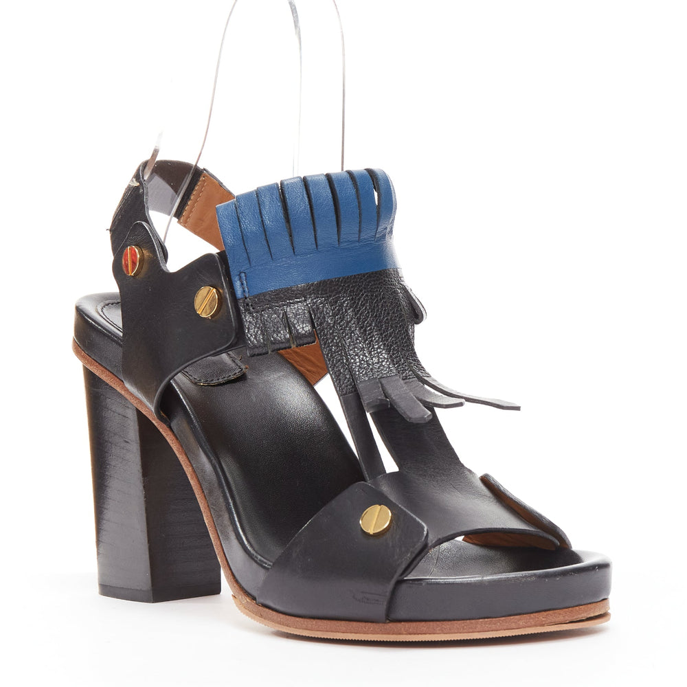 CHLOE black blue fringe detail gold nail grommet block heel sandal EU37