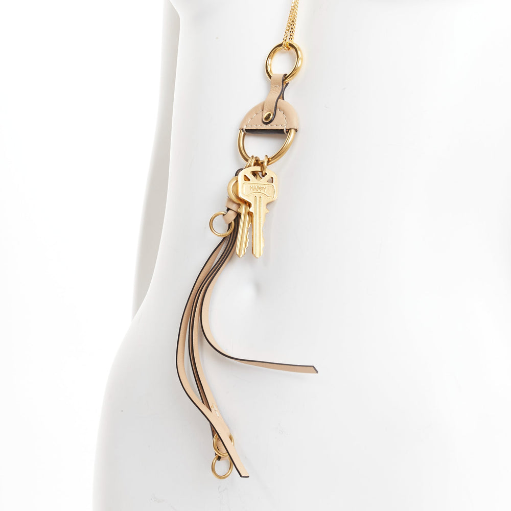 CHLOE Nicole brown leather gold Happy key chain bag charm long necklace
