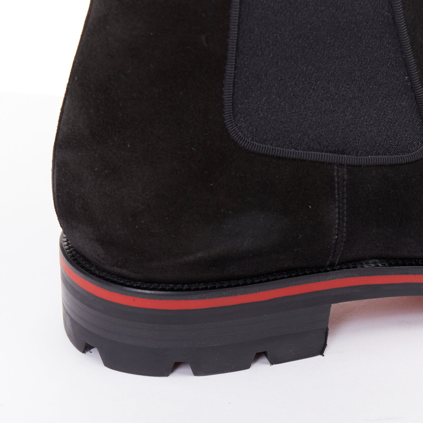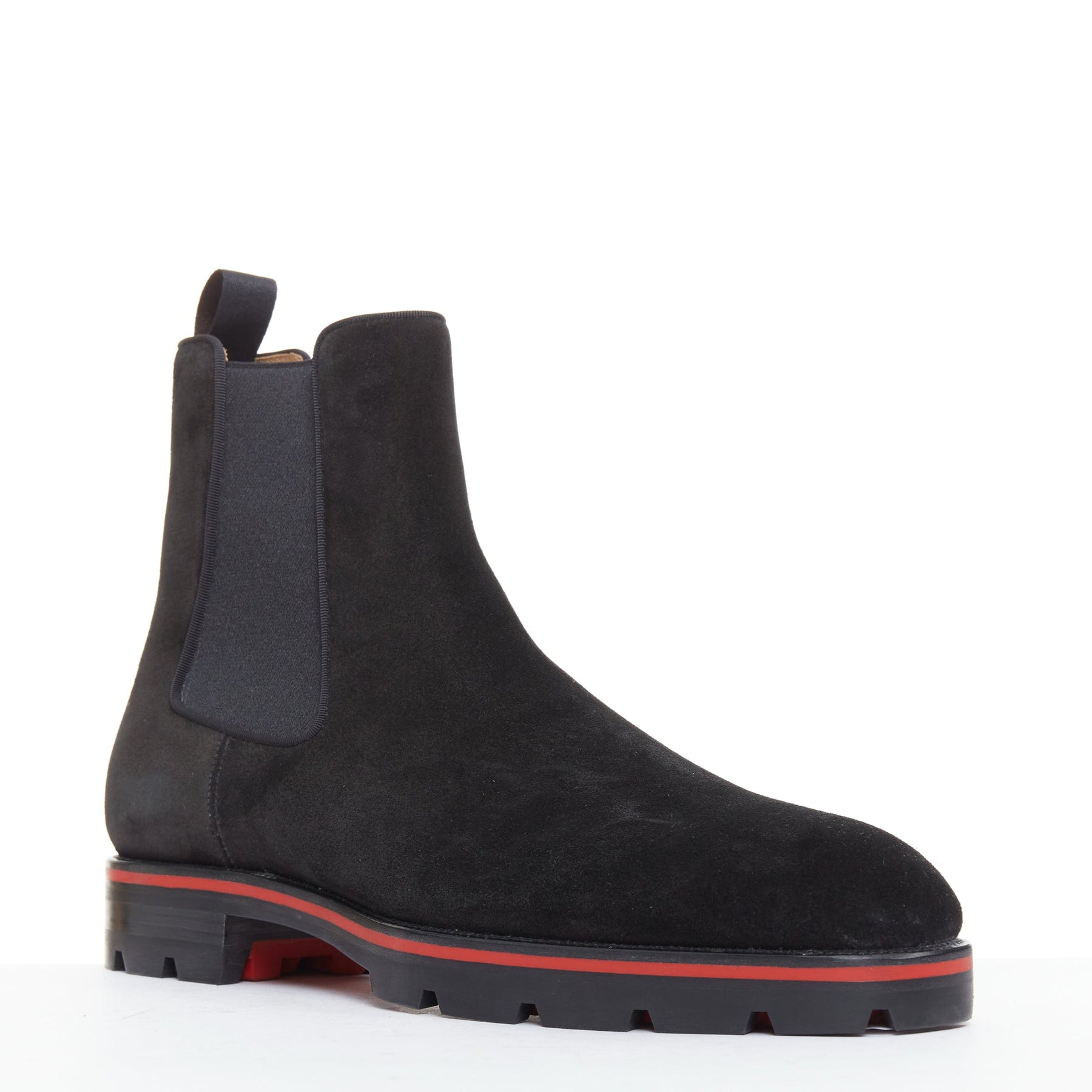 Extra Details: Crafted from soft black suede.. They feature a chunky, lugged rubber sole for durability and grip, outlined with the signature Loubi red stripe. The very bottom of the sole is the brand's iconic red. These are pull-on Chelsea boots with elasticated side panels and a heel tab for easy wear. The panels are outlined with a couture grosgrain ribbon trim.