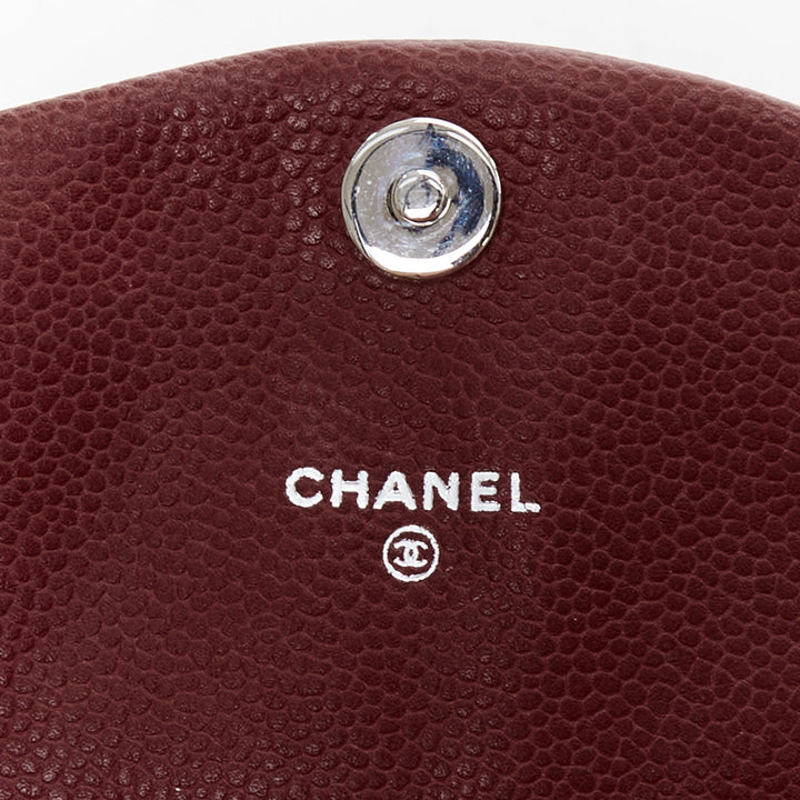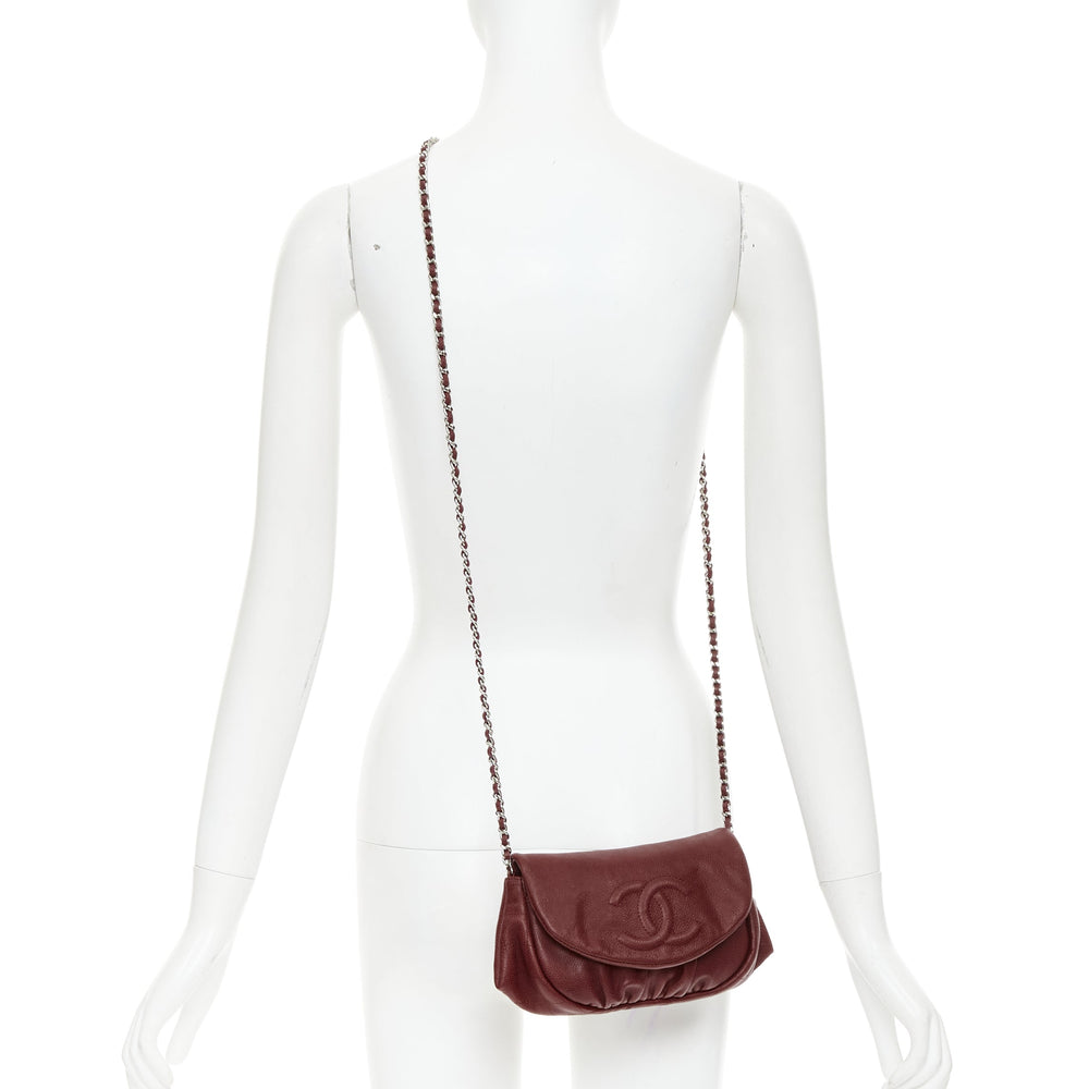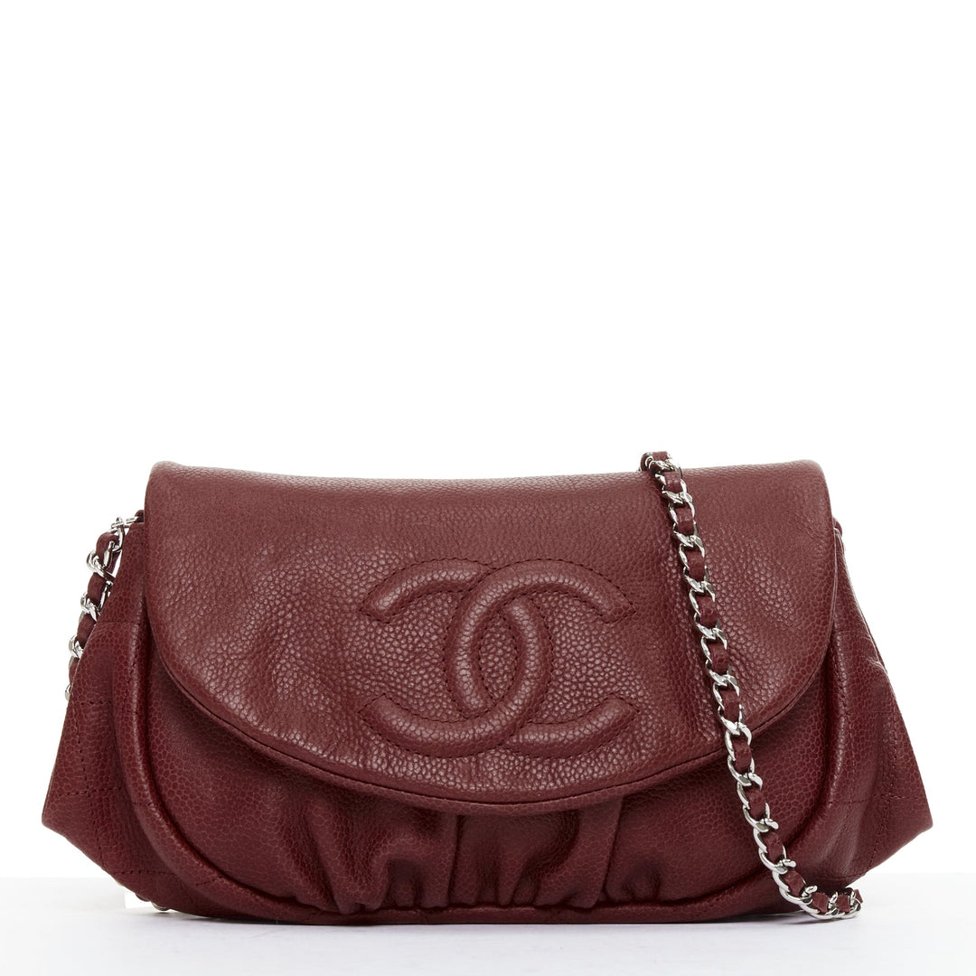 Extra Details: CHANEL grain Half Moon Wallet On Chain WOC in Dark Red. This stunning baguette is beautifully crafted of pleated luxurious caviar leather. The bag features a long silver chain link shoulder strap threaded with leather and a frontal flap with a quilted Chanel CC logo. The flap opens to a fabric interior with a zipper and patch pockets.