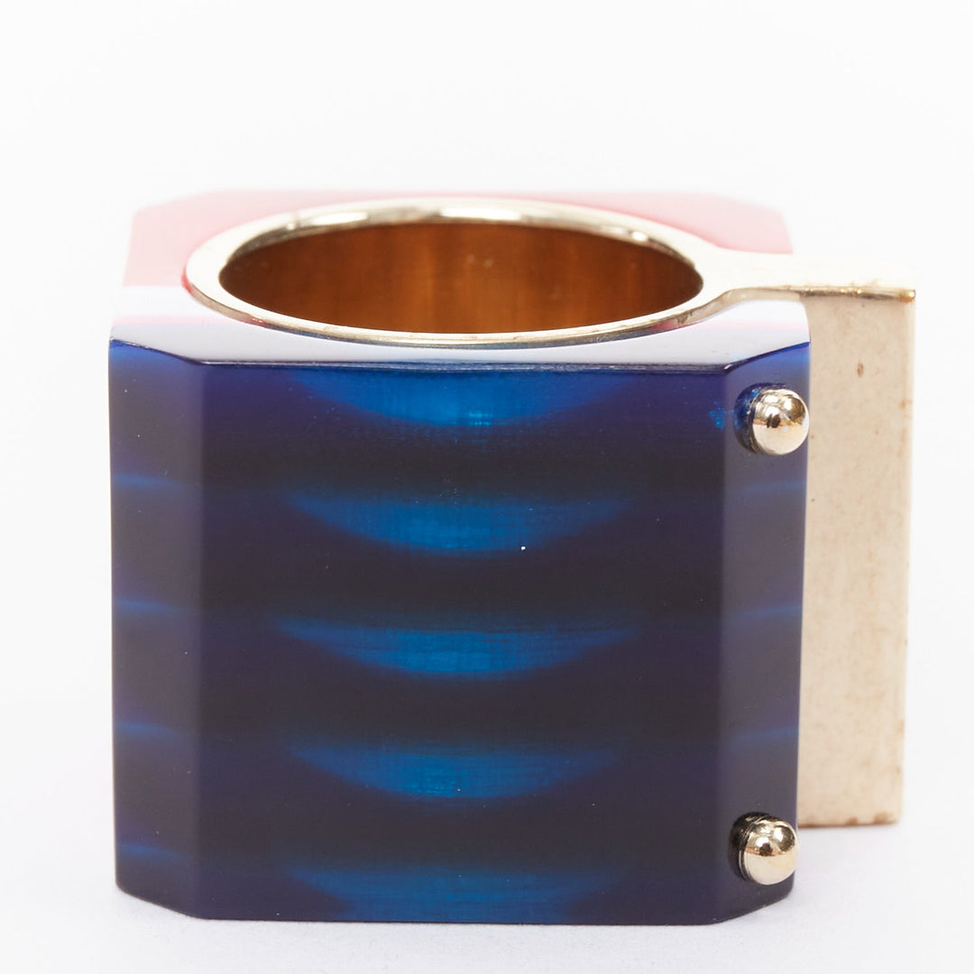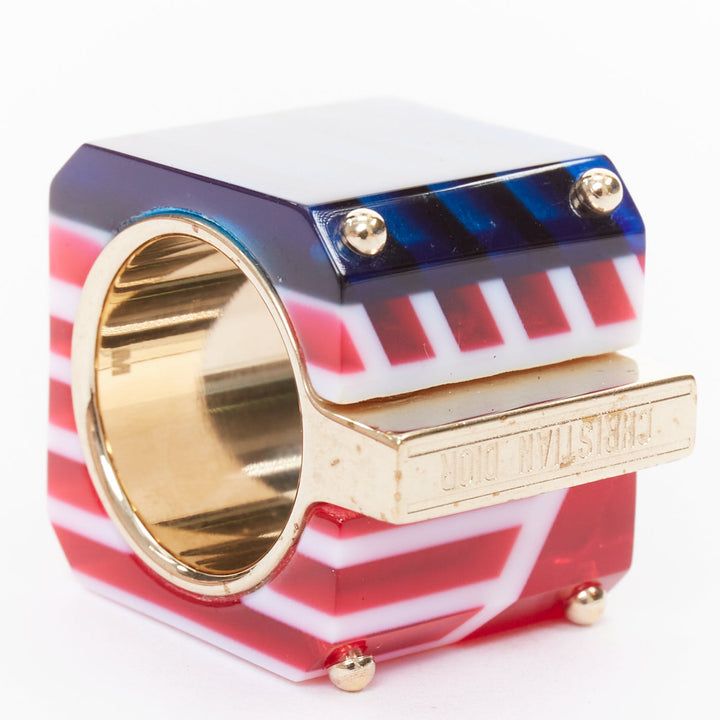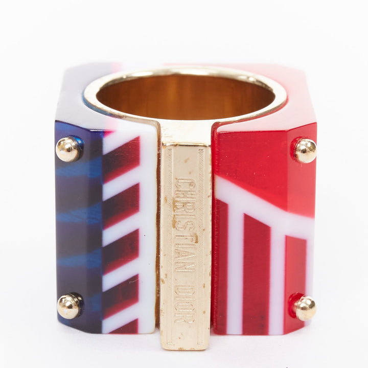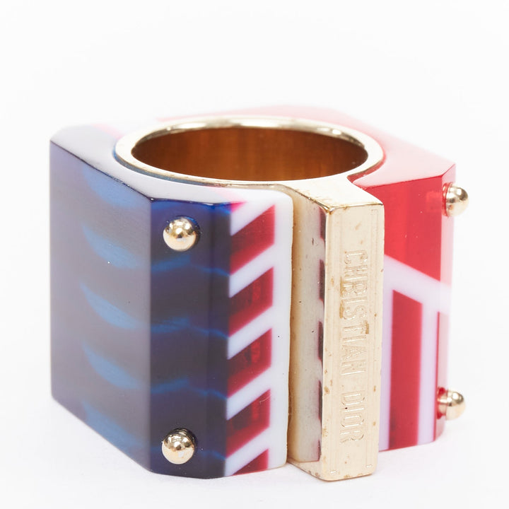 DIOR 2922 Sorbet Cube red blue geometric resin gold logo statement ring US6.5
