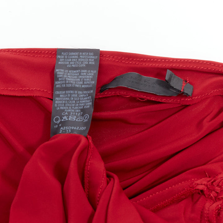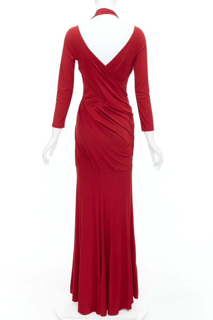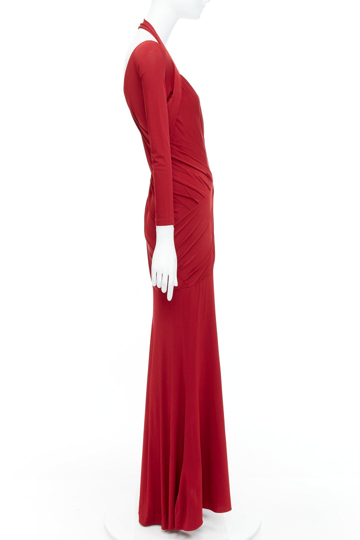 DONNA KARAN red halter plunge tucked draped evening gown dress L