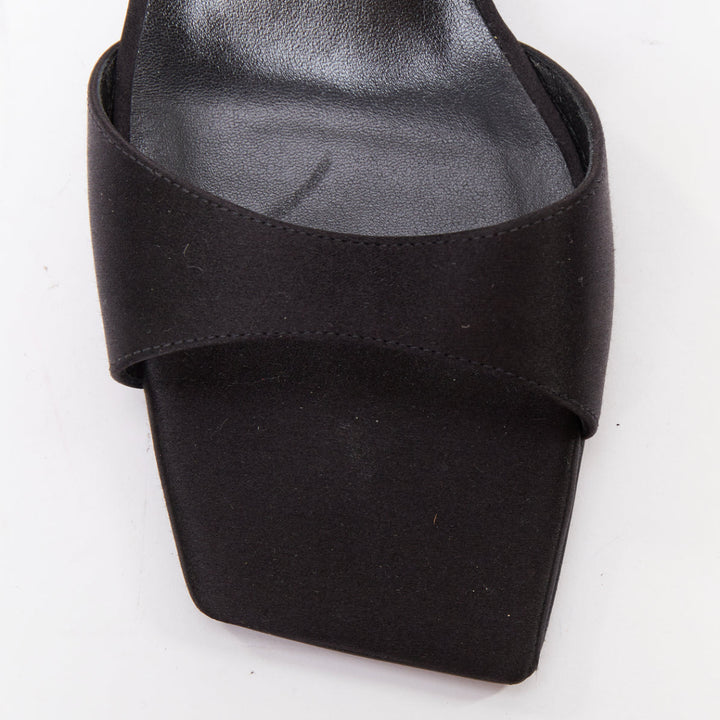Extra Details: Black slip-on heeled sandals crafted from a viscose-and-silk blend satin. Features an open square toe, graphic hardware at the heel tab, logo-embossed padded calfskin footbed, kitten heel with rubber injection, and a leather sole.