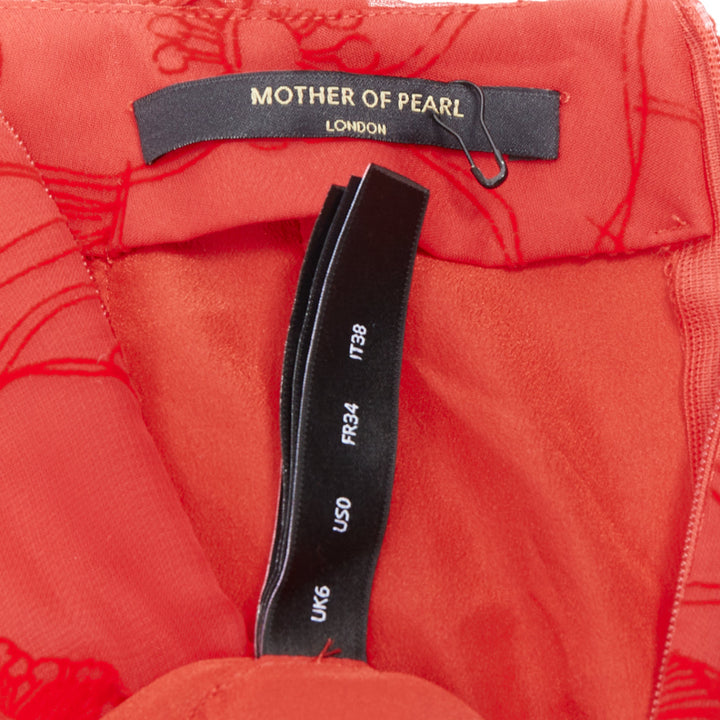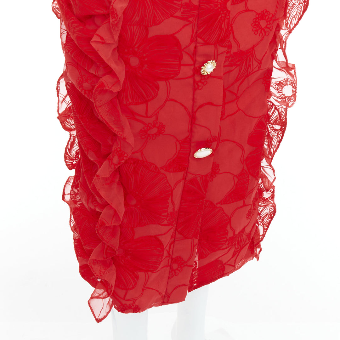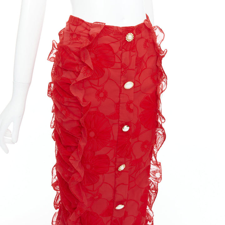 MOTHER OF PEARL LONDON red velvet sheer ruffle button pencil skirt UK6 XS
