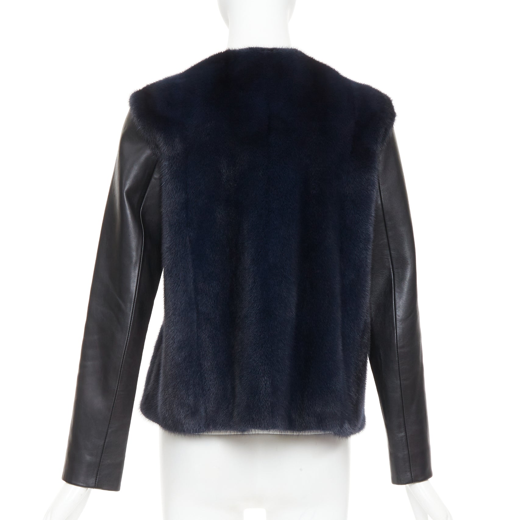 CHRISTIAN DIOR navy natural fur black soft leather sleeve silk lined jacket