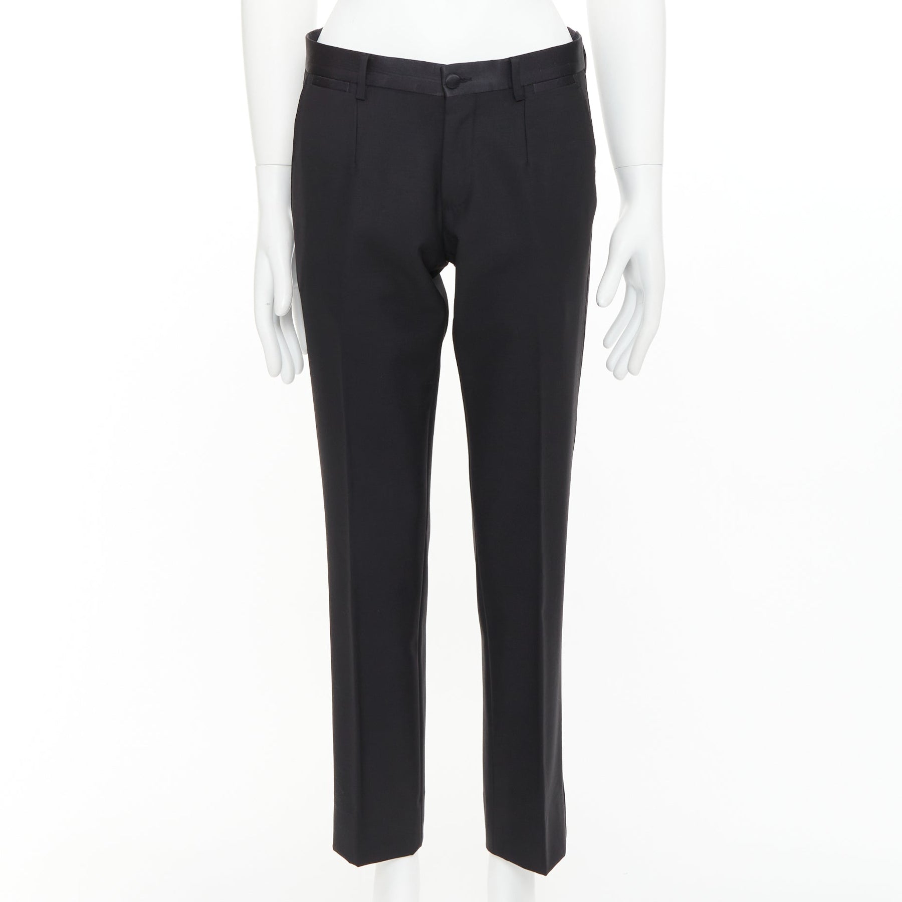 DOLCE GABBANA black wooly satin waist trim taperd mid waist pants IT44 XS