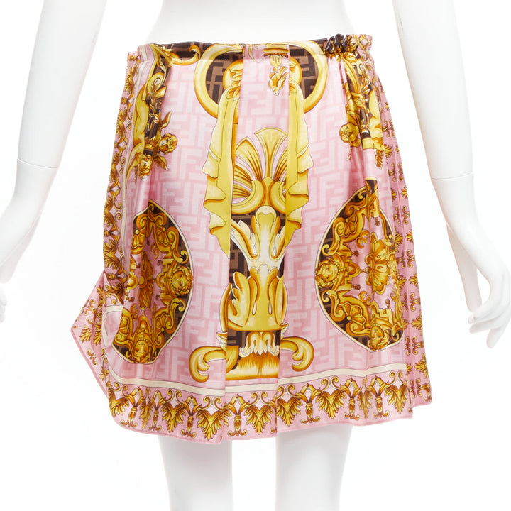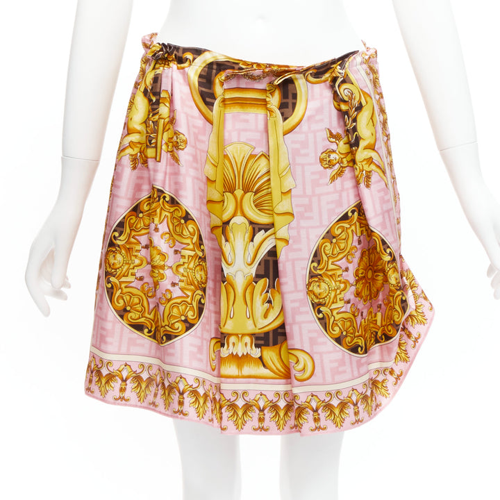FENDACE FENDI VERSACE 2022 Runway pink gold baroque Zucca side drape skirt IT42 M