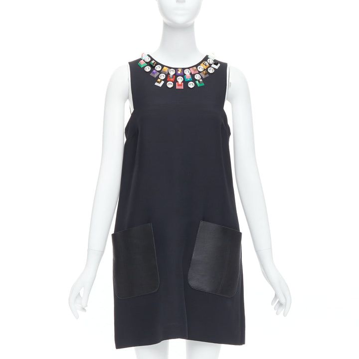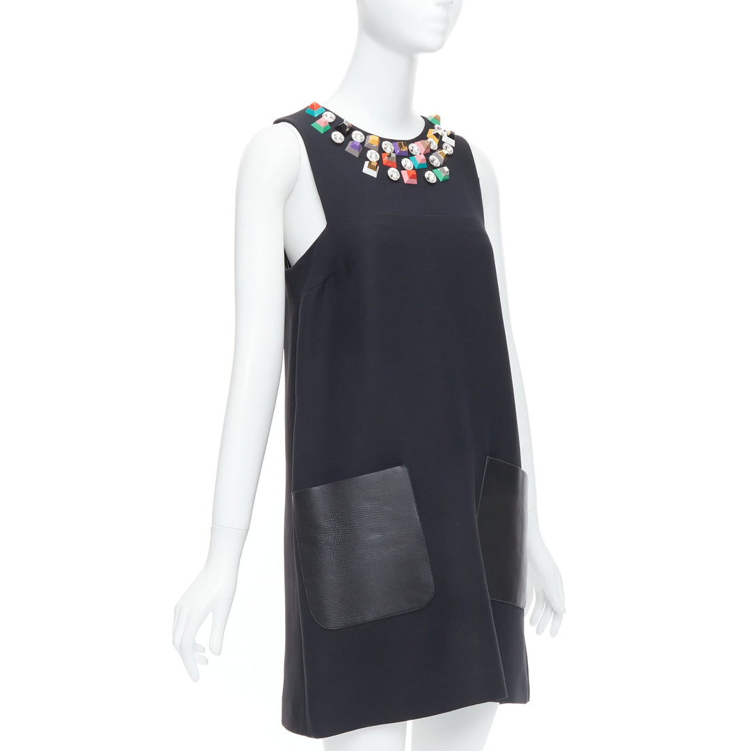 FENDI black multicolour studded rhinestone neckline leather pocket dress IT42 M