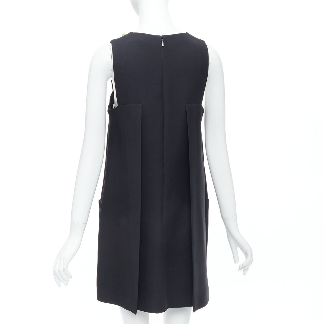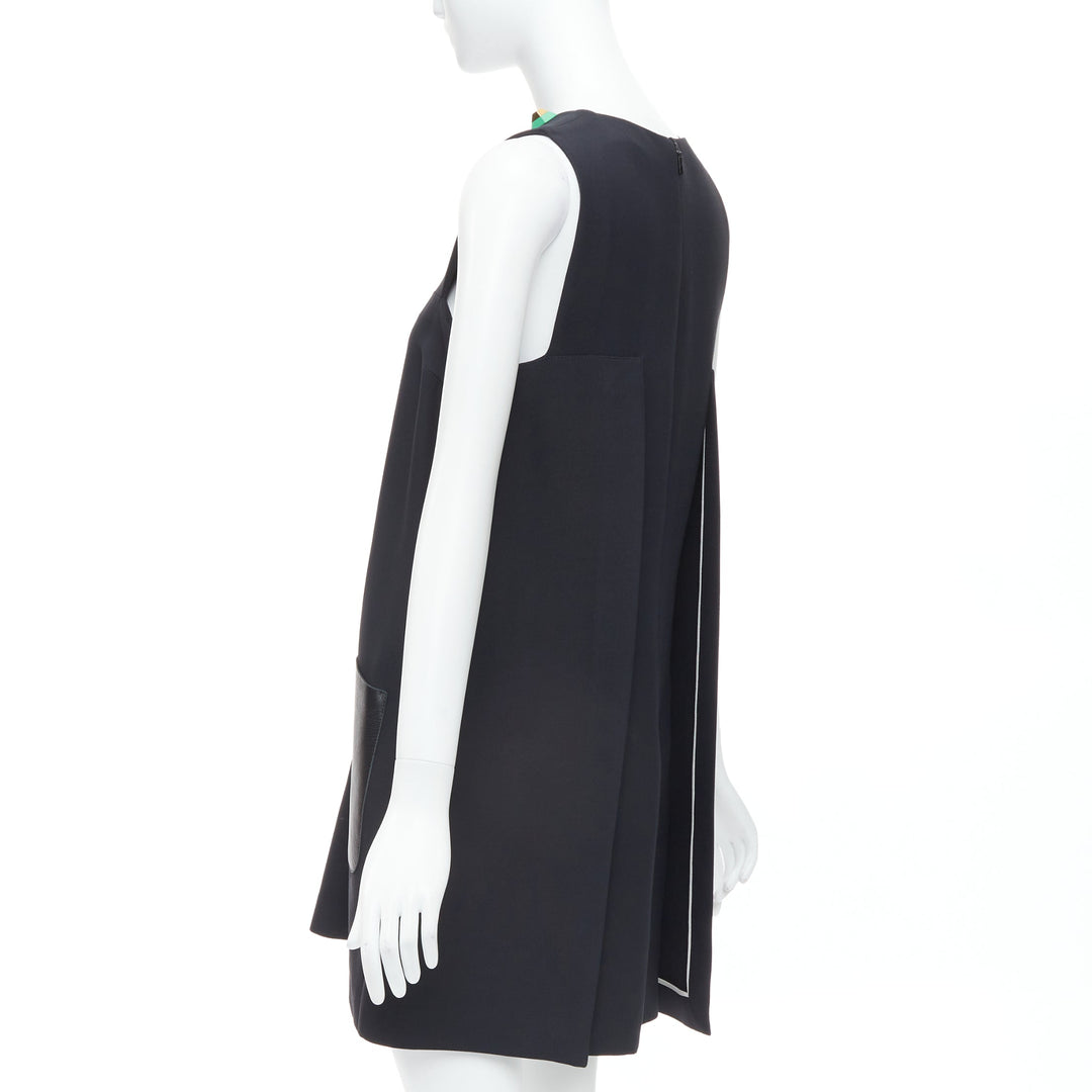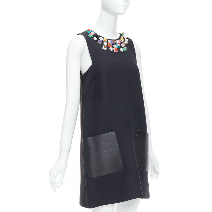 FENDI black multicolour studded rhinestone neckline leather patch pocket dress IT42 M
