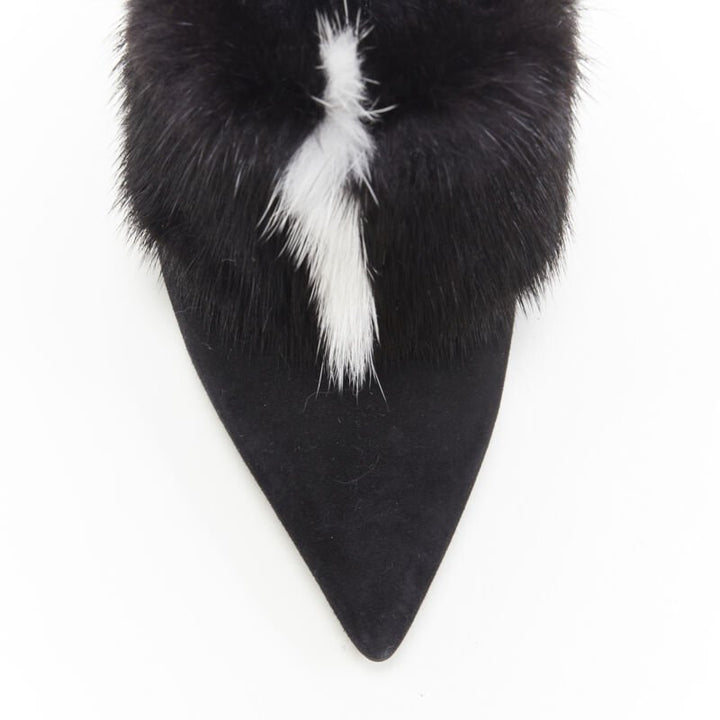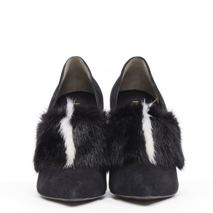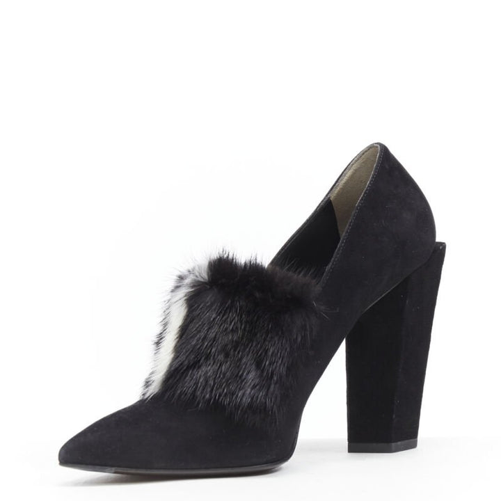 FENDI black suede black white mink fur front point toe chunky heel pump EU37.5