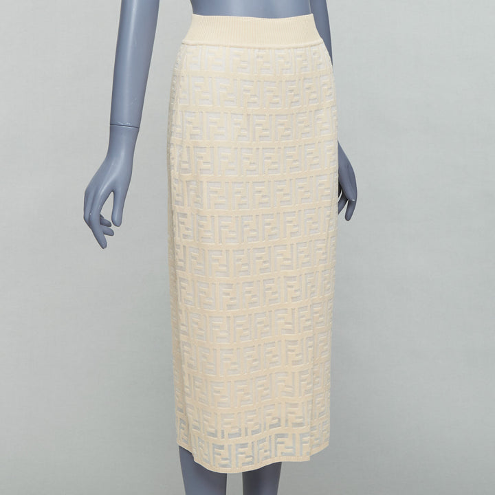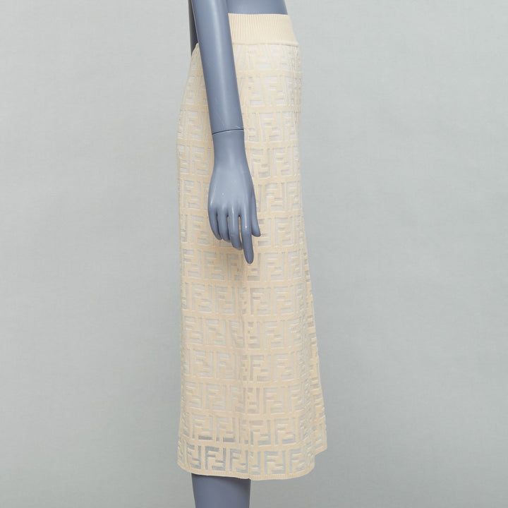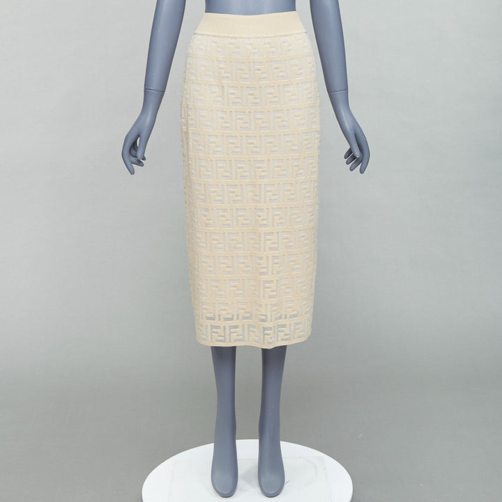 FENDI cream beige cotton blend FF Zucca monogram knit pencil skirtIT IT42 M