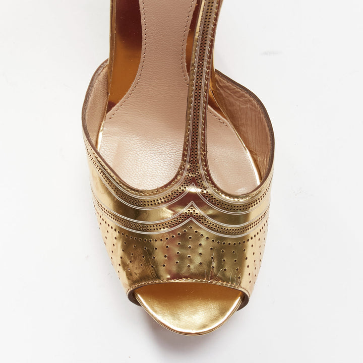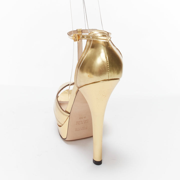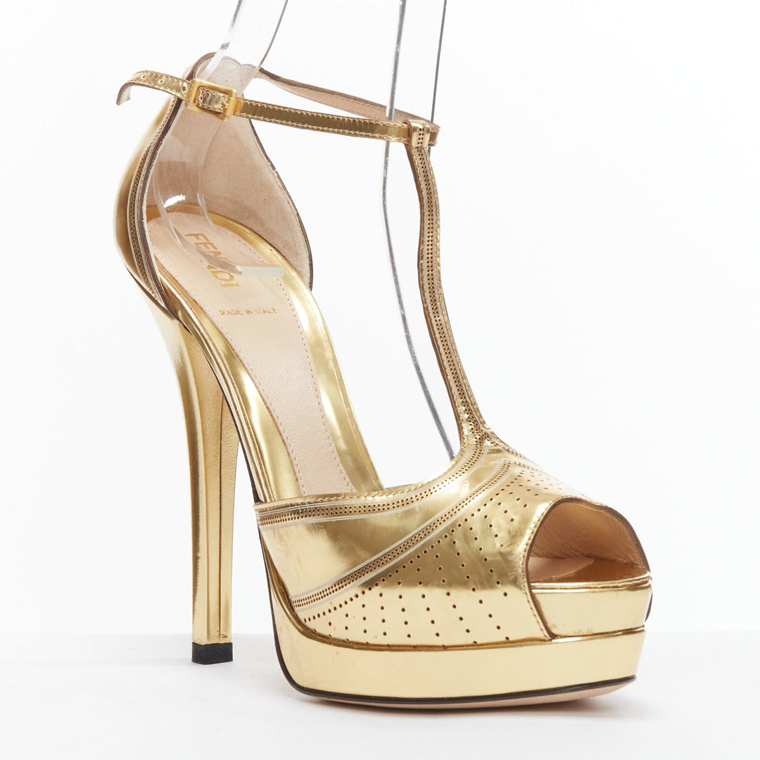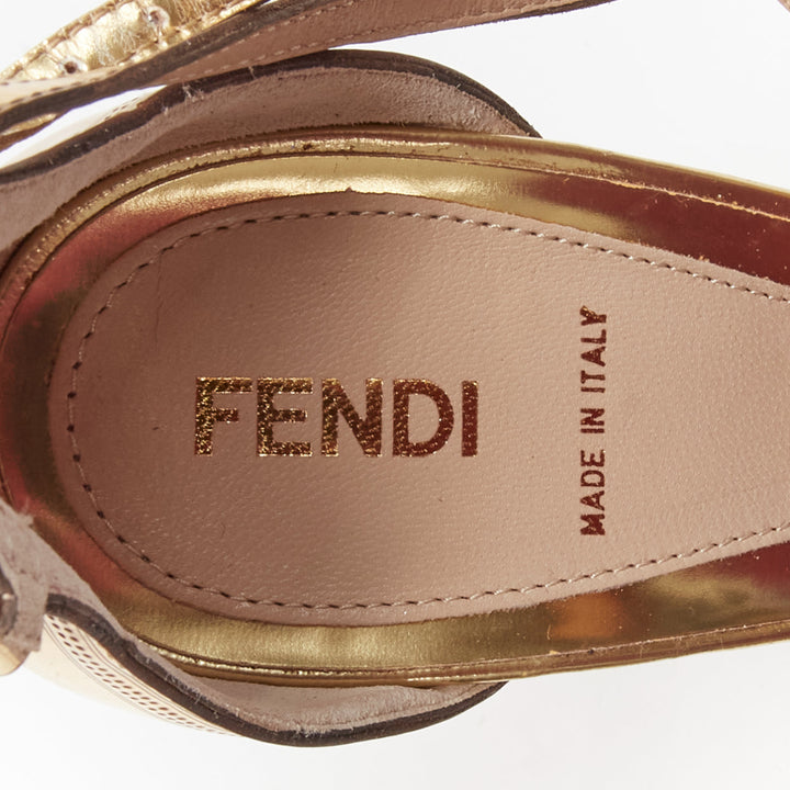 FENDI Flo metallic gold leather perforated tstrap peep toe platforms EU38
