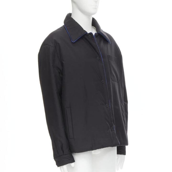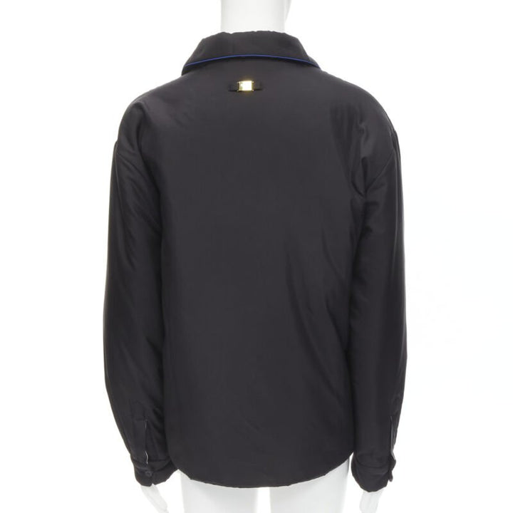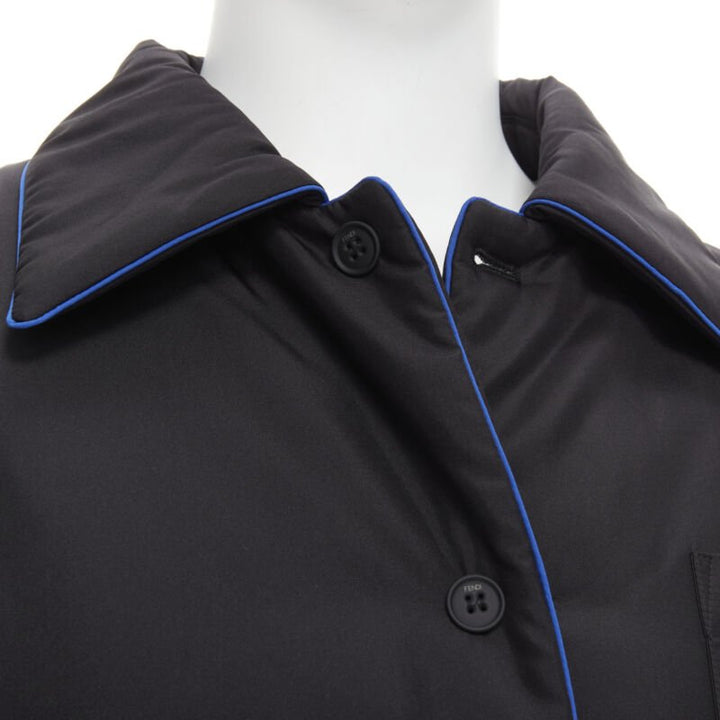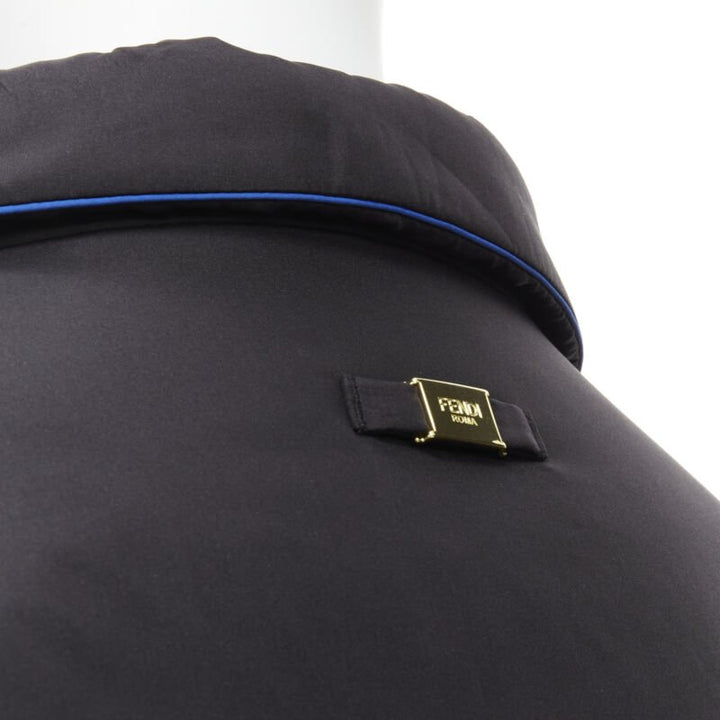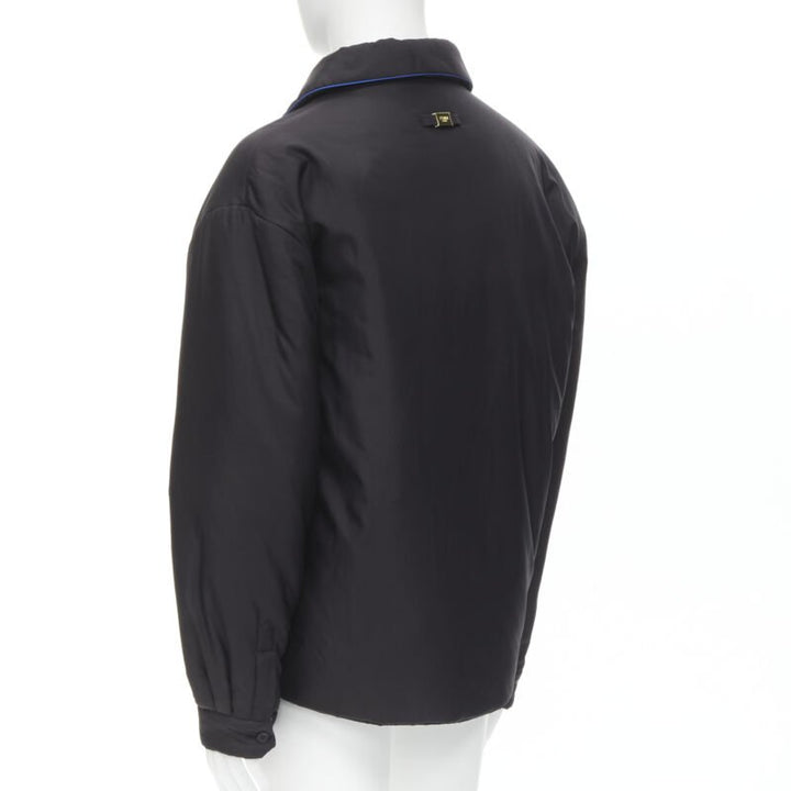 Extra Details: Reversible padded jacket. 100% silk on both sides- one side on black with blue piping. White Fendi logo intarsia logo silk. 3-pockets on both sides. Button front closure. Button cuff. Padded in polyester.