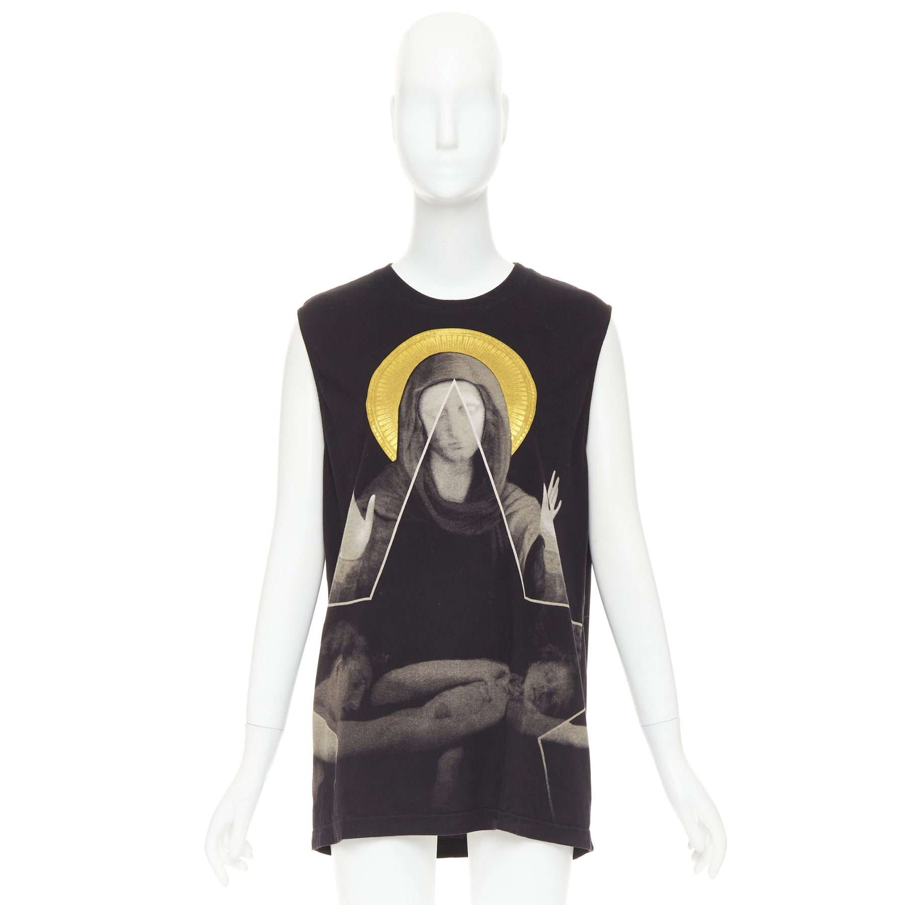 Extra Details: This specific design was featured in the Spring/Summer 2013 menswear collection and was also released as a limited edition for the Lane Crawford charity collection in 2011/2012. The sleeveless, black cotton muscle tee or t-shirt features a striking graphic print of the Virgin Mary, with a gold-toned halo detail. A distinctive white geometric outline, resembling a triangle or star, is overlaid on the print.
