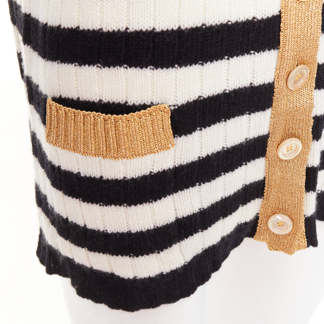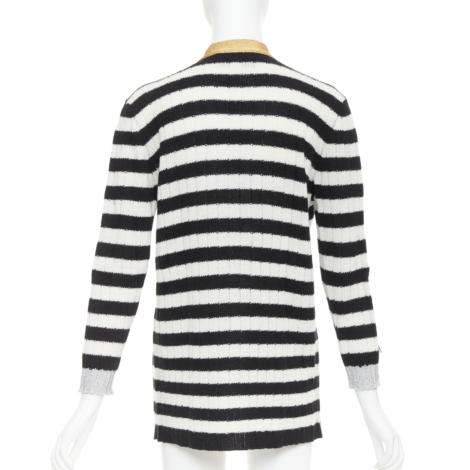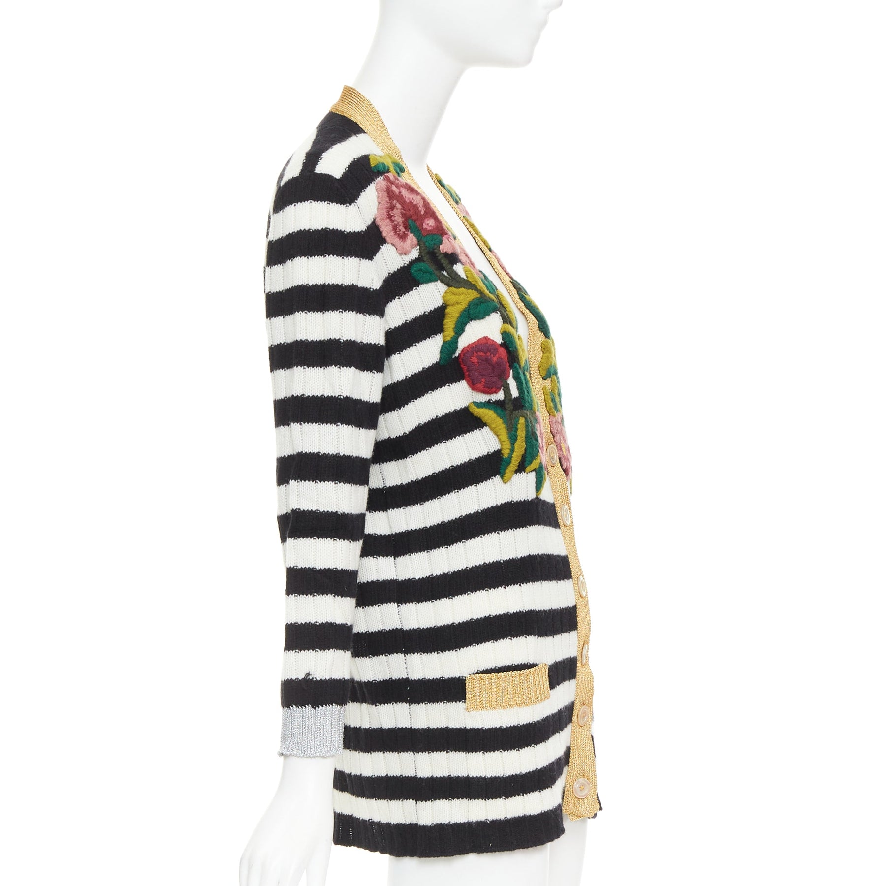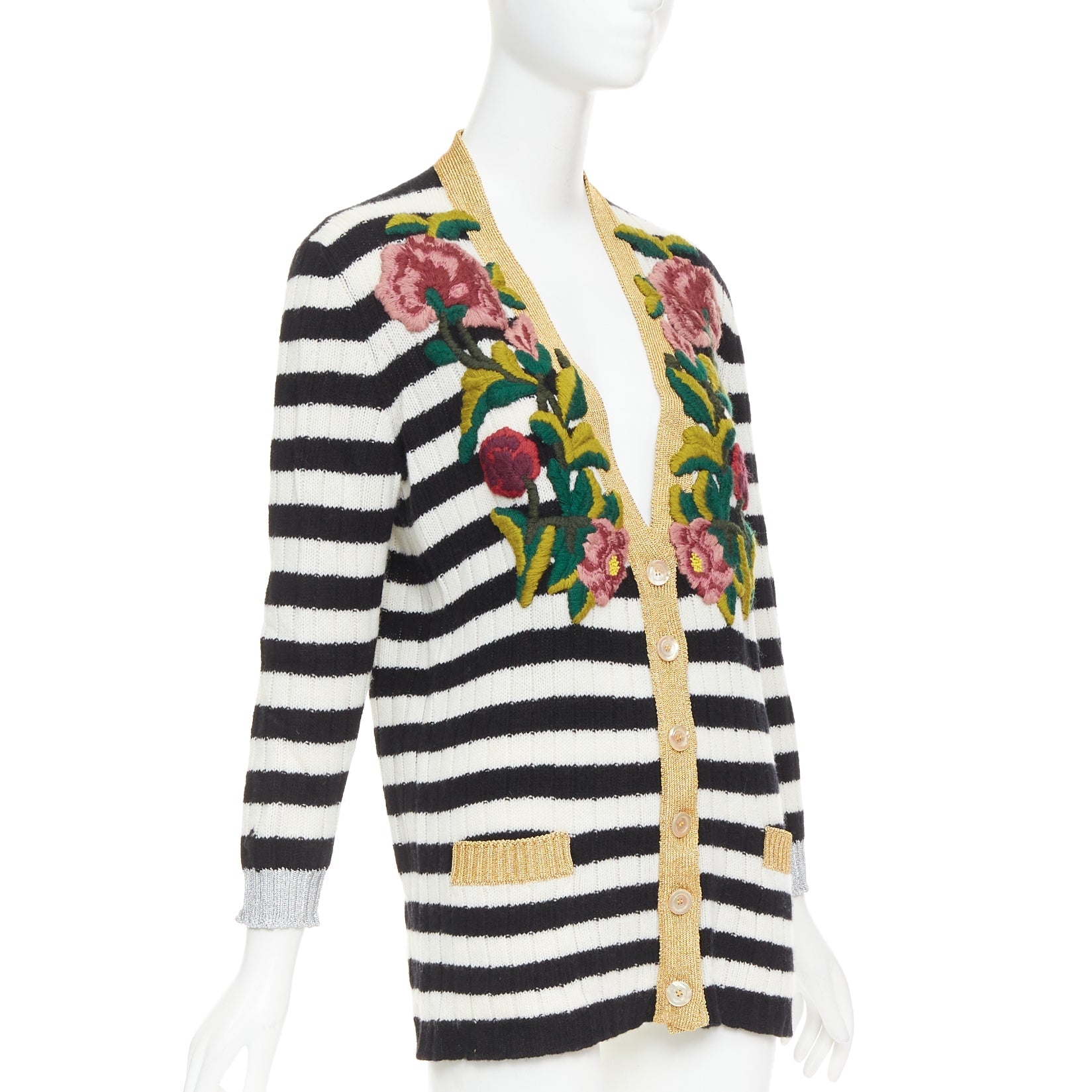 Extra Details: The cardigan features a monochrome black and white striped knit body with contrasting metallic gold-tone lamé trim along the V-neckline, button placket, and two front slip pockets. Adorned with signature floral appliques embroidered on the front shoulders and chest.