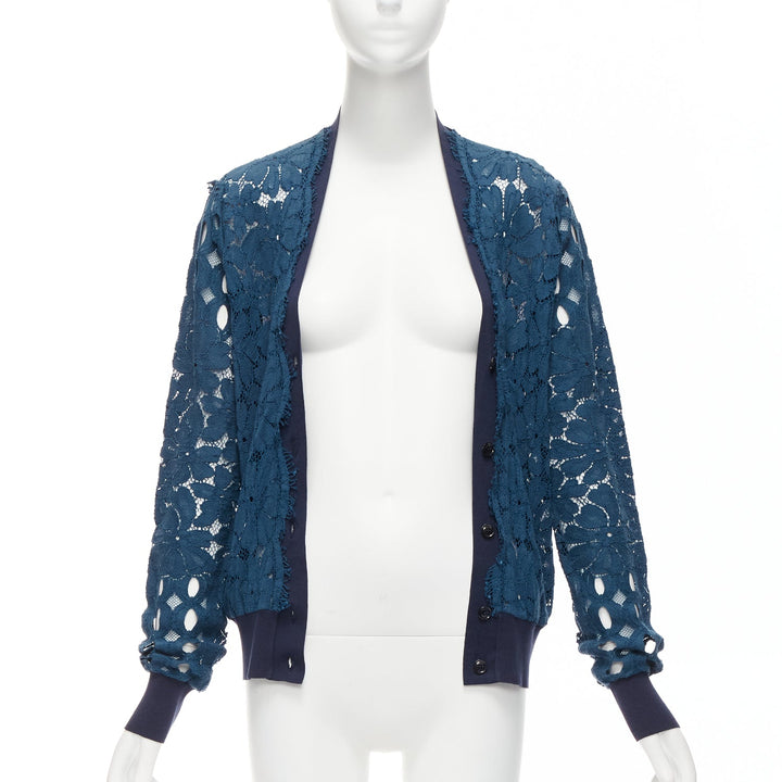 LANVIN 2015 blue silk cotton floral lace sheer long sleeve V neck cardigan S