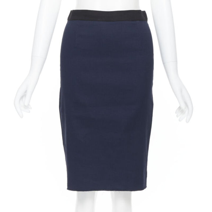 LANVIN ALBER ELBAZ 2014 navy blue linen blend exposed zip pencil skirt FR34 26"