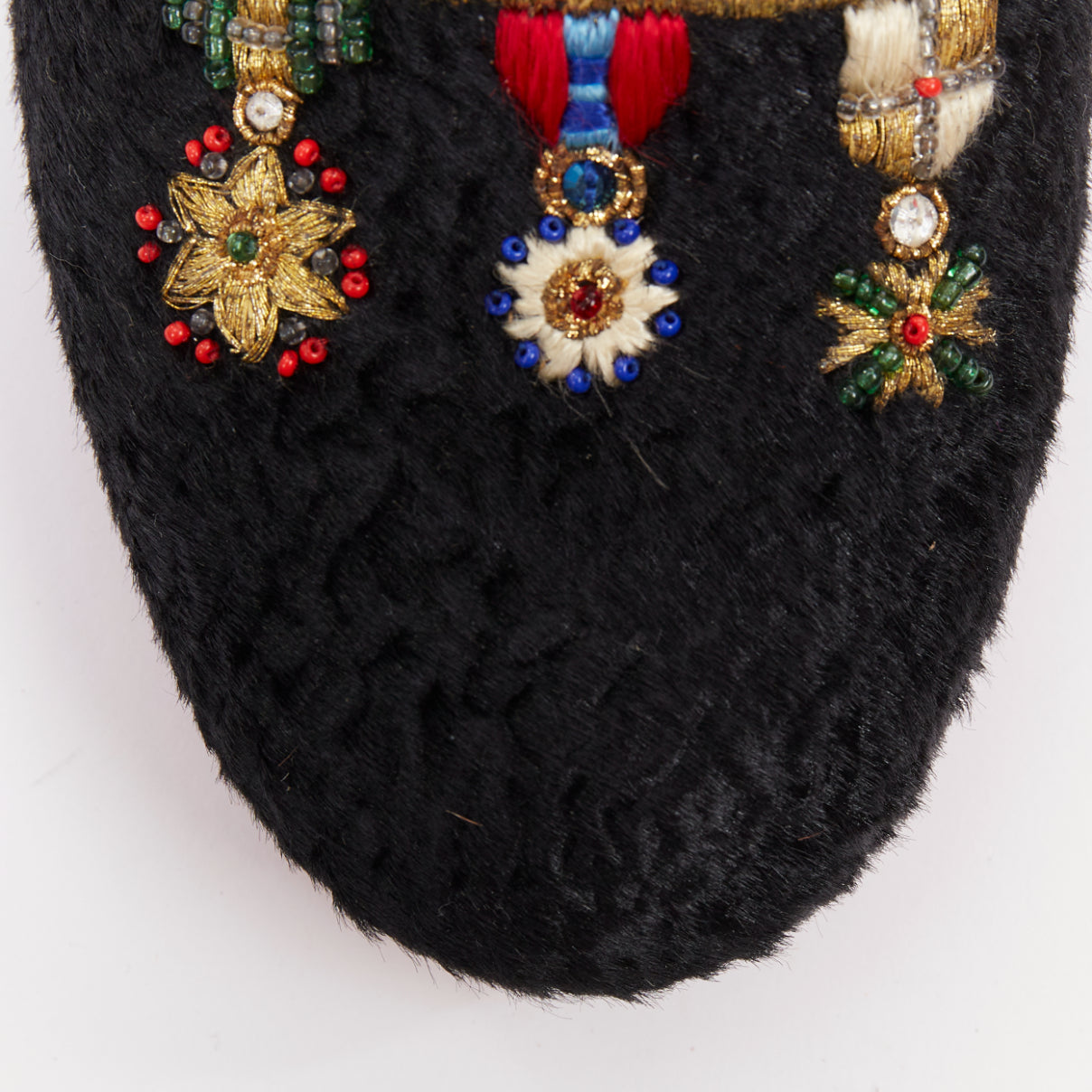 Extra Details: They feature elaborate, colorful military-inspired embroidered medal and brooch appliques on the vamp. Signature red-lacquered leather soles.