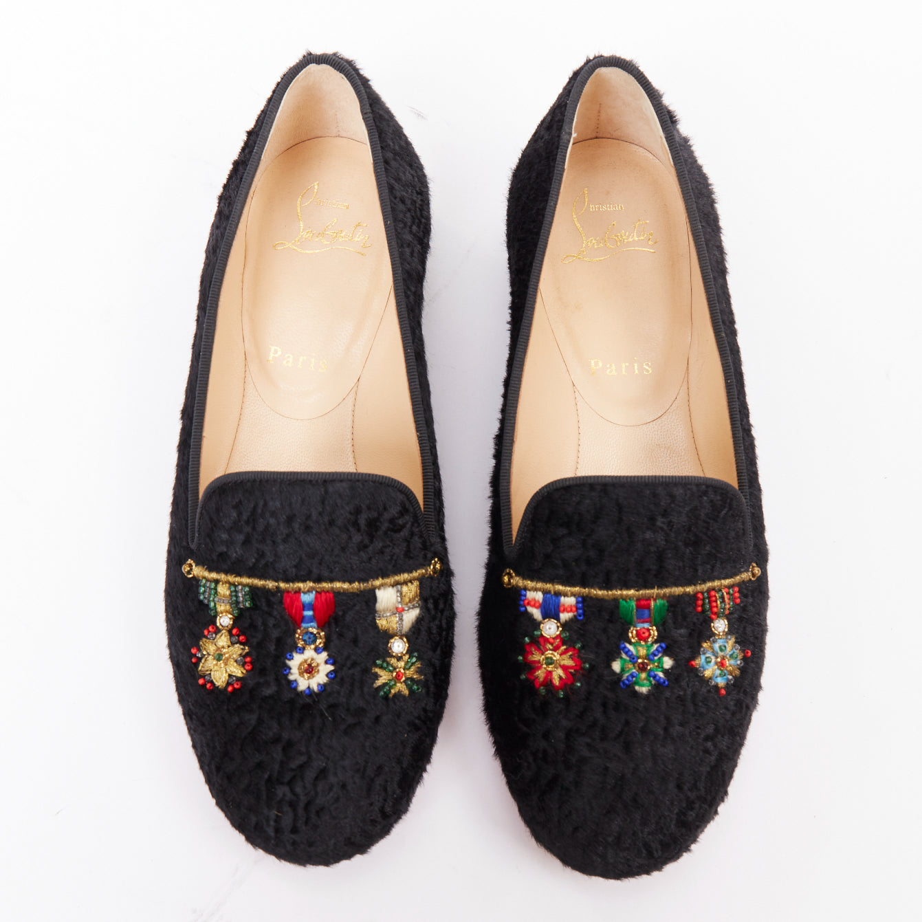 CHRISTIAN LOUBOUTIN Dictateur persian lamb fur Medallion embroidered flats EU37