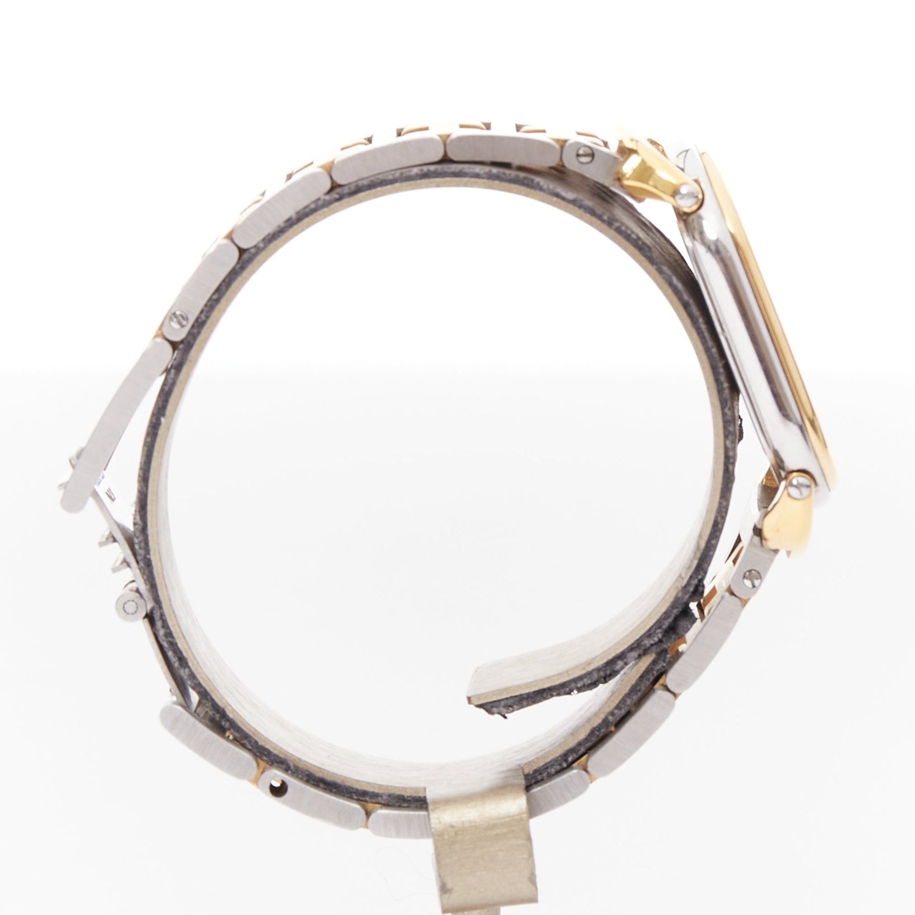 Extra Details: Distinctive oval case with "saddle handles" (lugs). Stainless steel case and bracelet with gold-plated accents on the bezel and central bracelet links. The dial is ivory or cream-colored with luminescent Arabic numerals. Swiss-made quartz (battery-powered) movement.