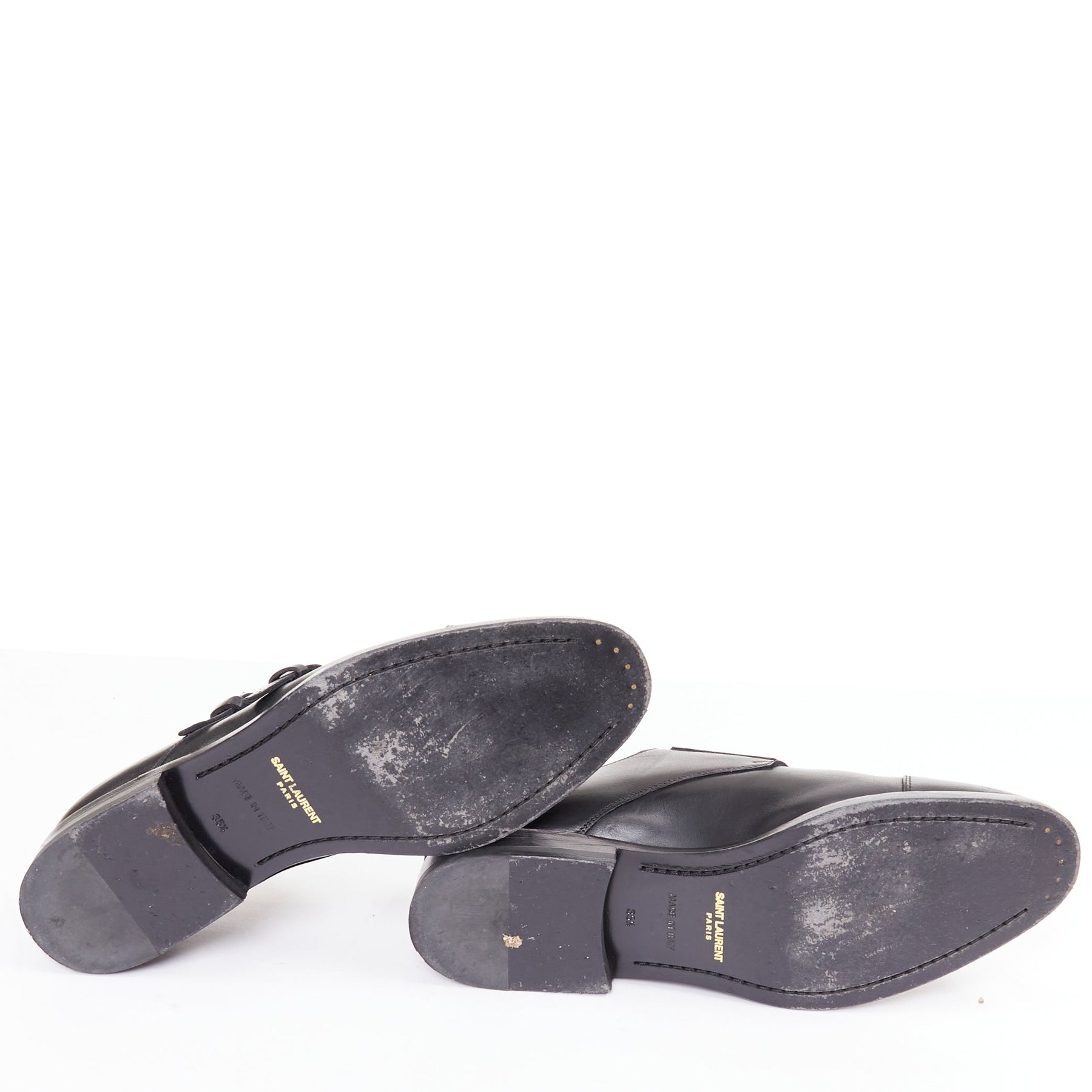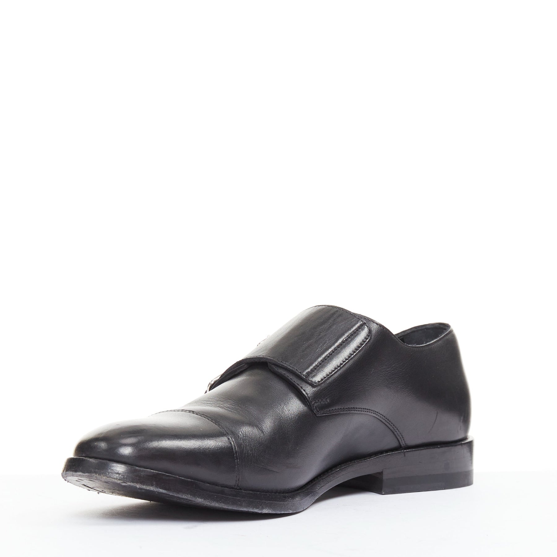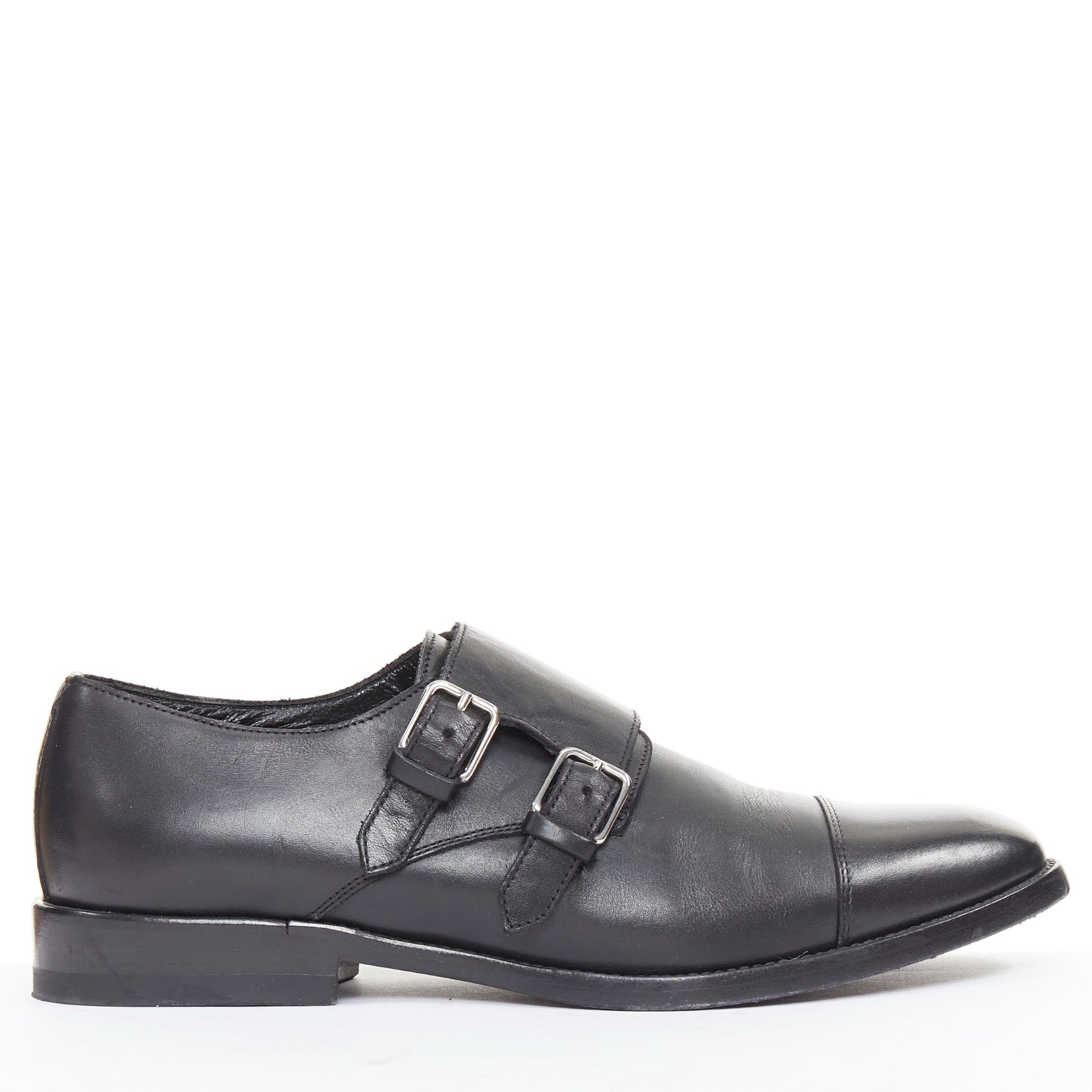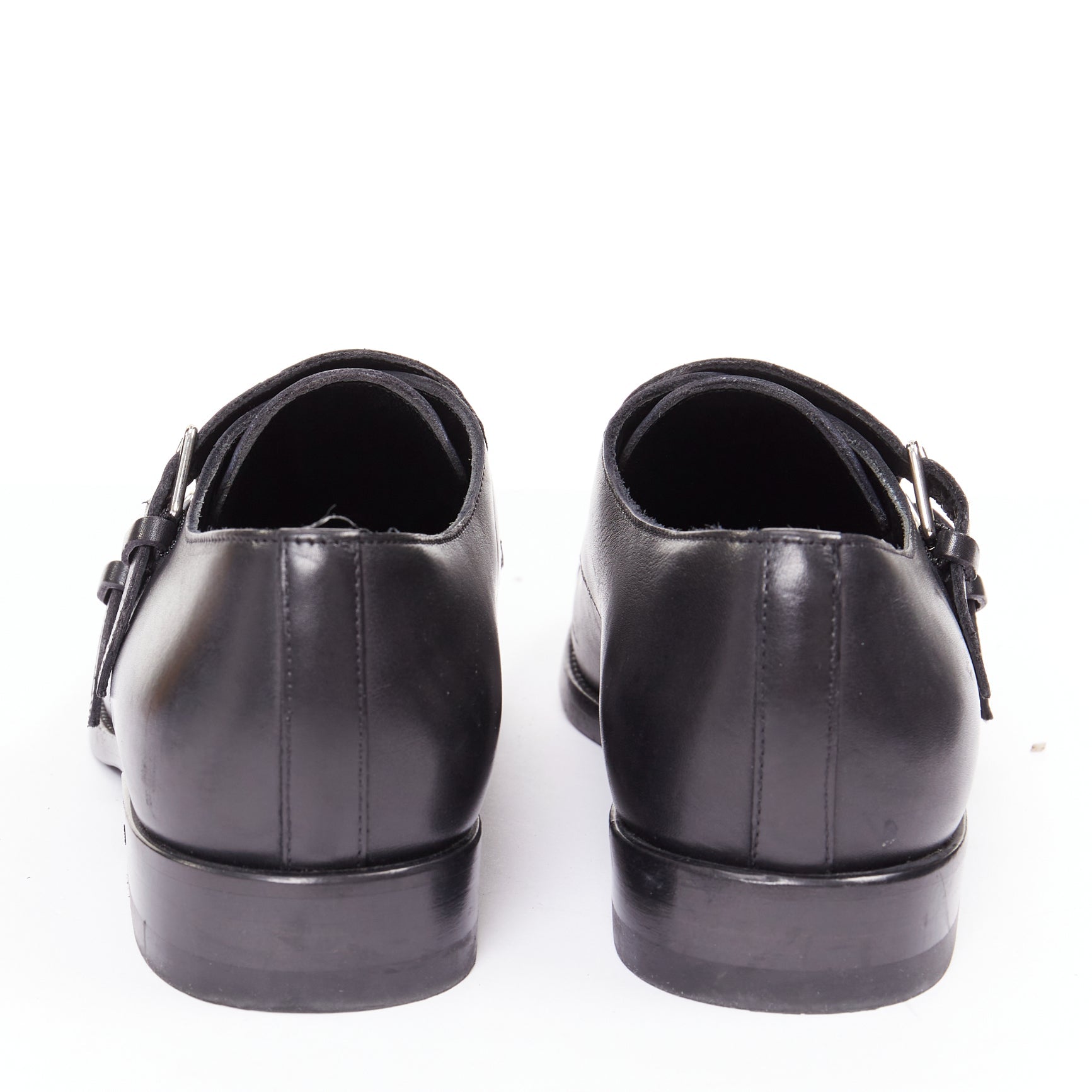 SAINT LAURENT black leather silver buckle double monk strap oxford shoes EU35.5