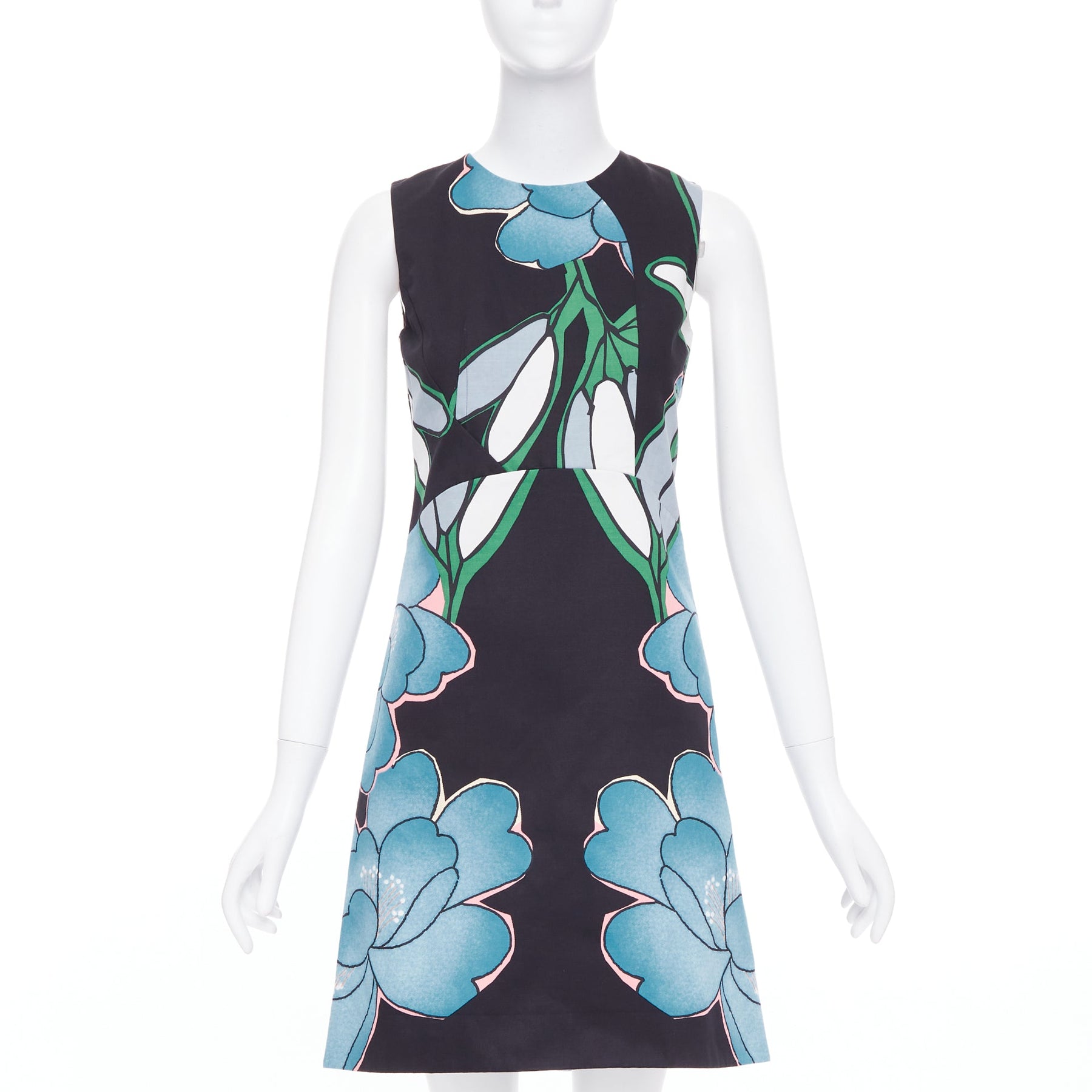 MARNI blue black cotton linen large flower print shift dress IT38 XS