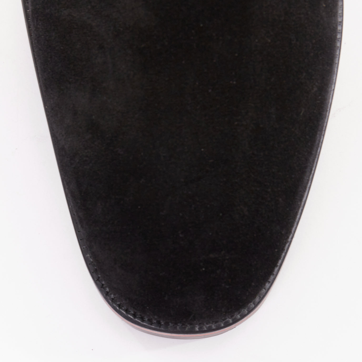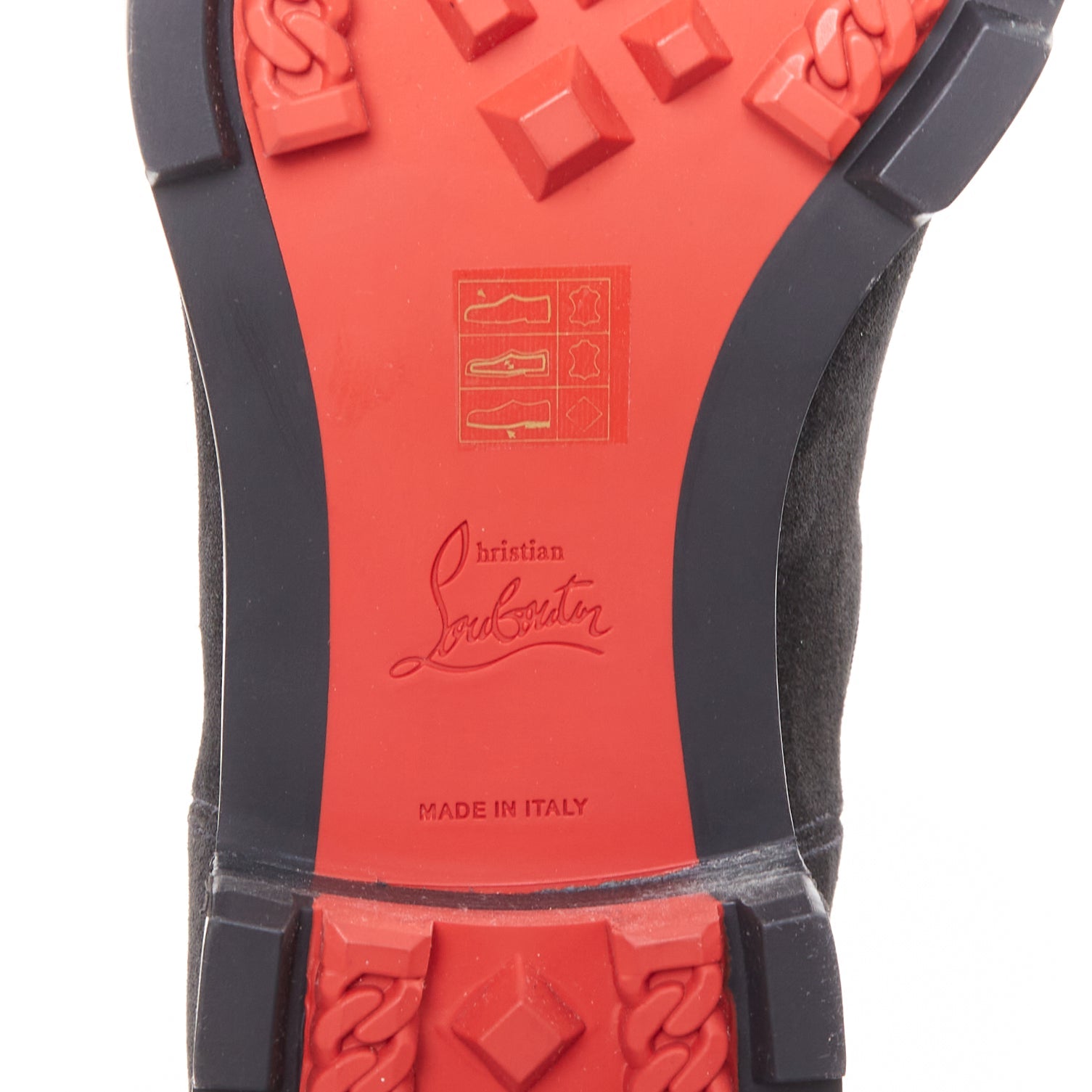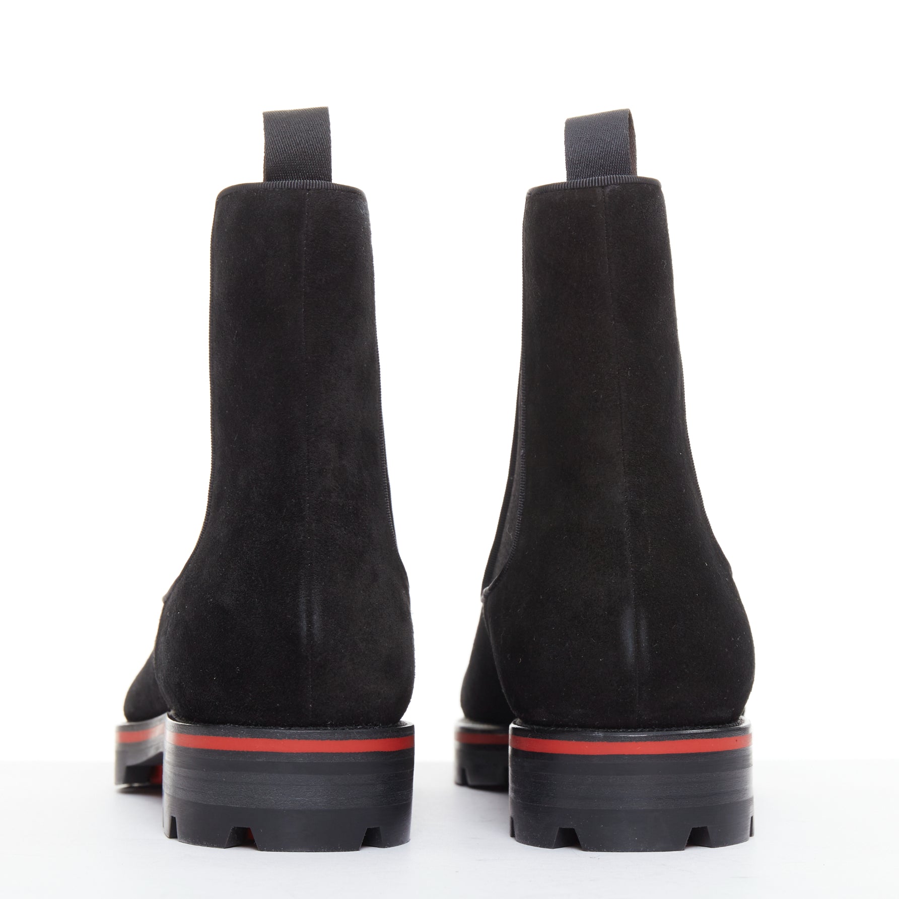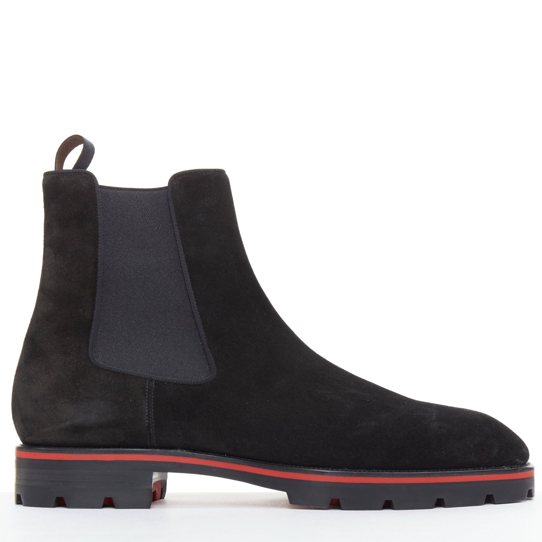 Extra Details: Crafted from soft black suede.. They feature a chunky, lugged rubber sole for durability and grip, outlined with the signature Loubi red stripe. The very bottom of the sole is the brand's iconic red. These are pull-on Chelsea boots with elasticated side panels and a heel tab for easy wear. The panels are outlined with a couture grosgrain ribbon trim.