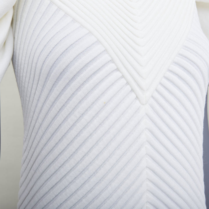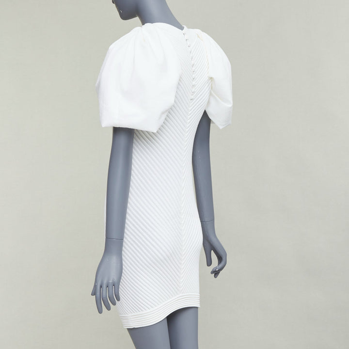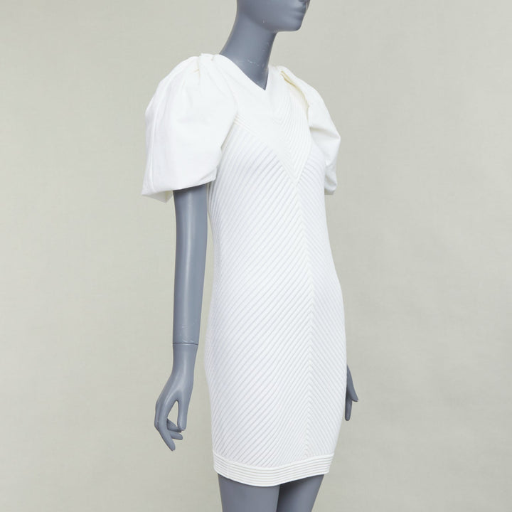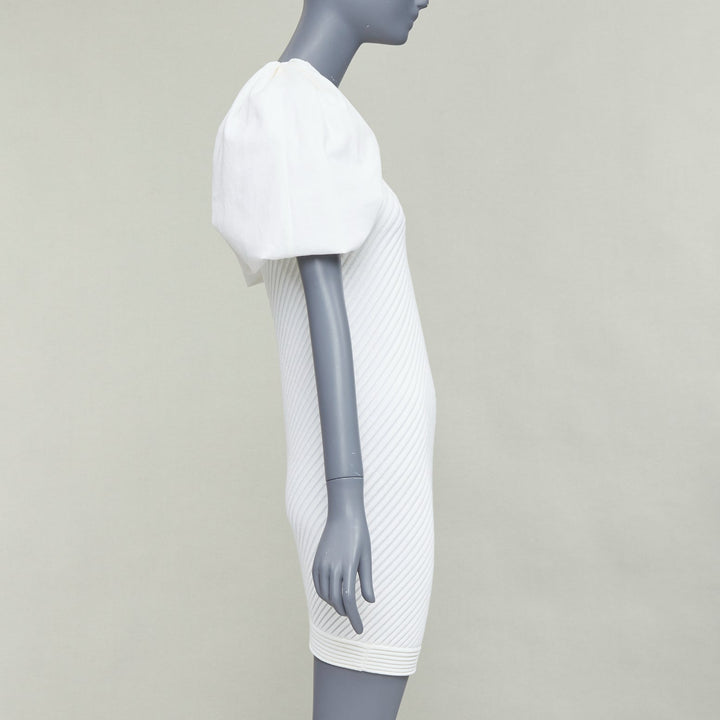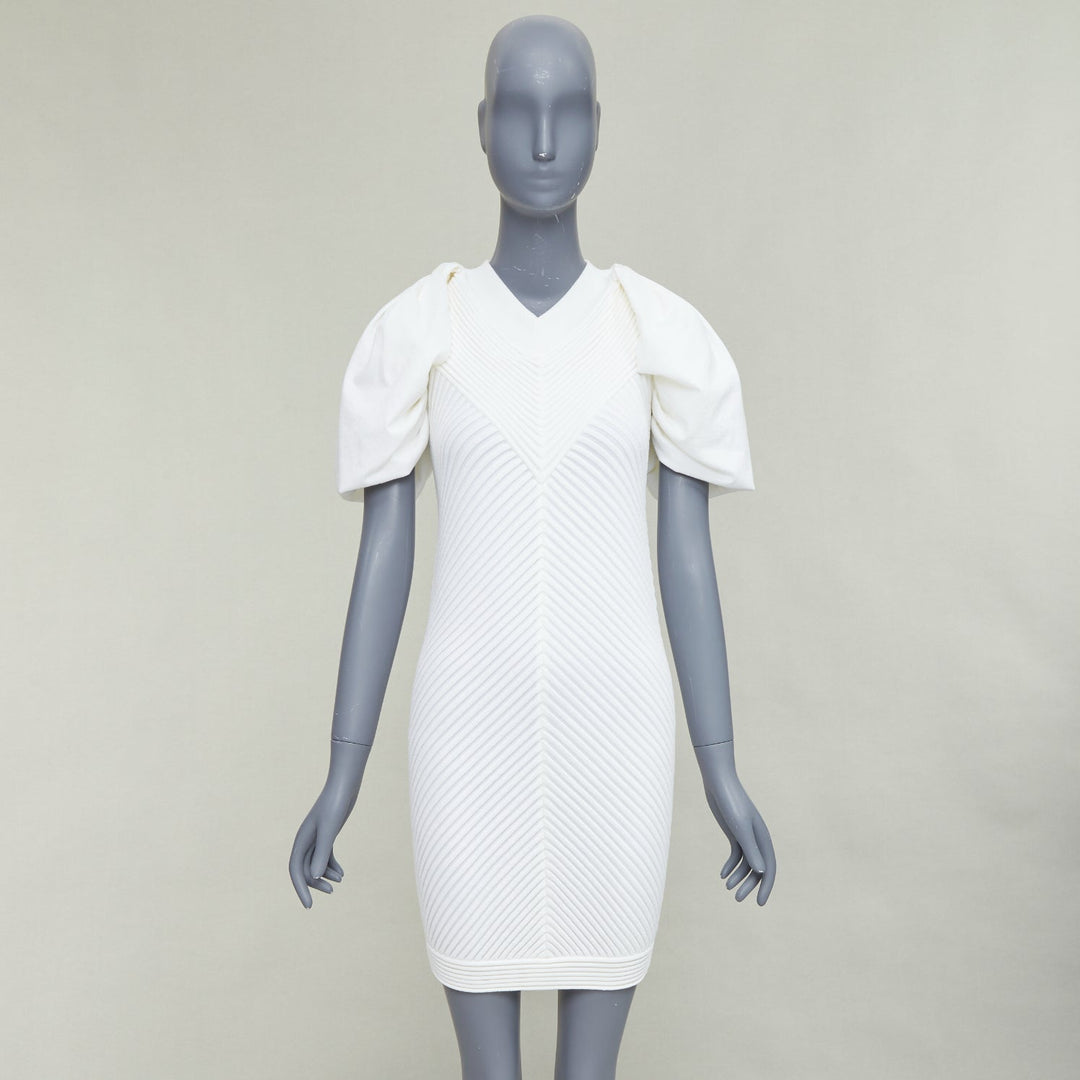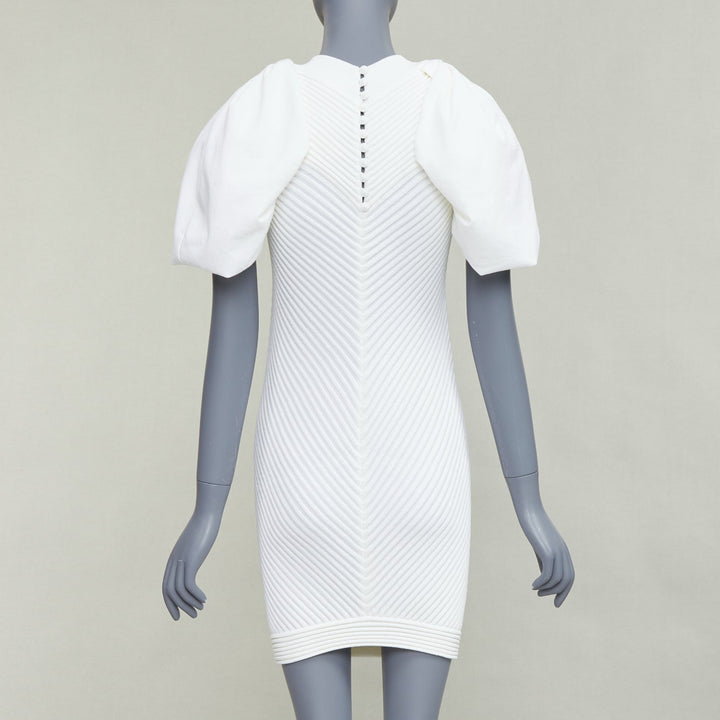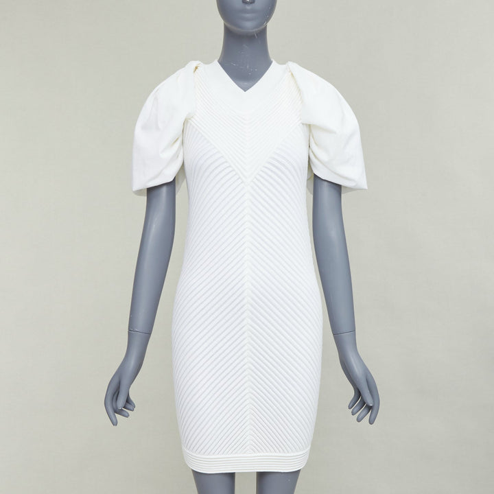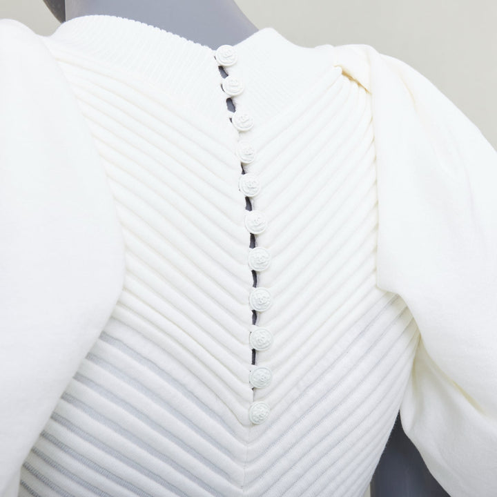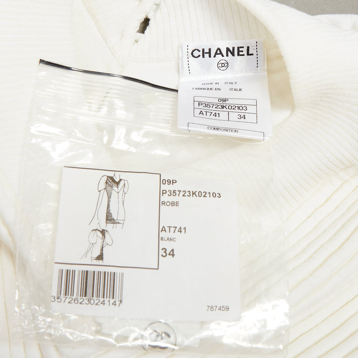 CHANEL 09P white cotton blend chevron puff sleeve CC buttons knit dress FR34 XS
