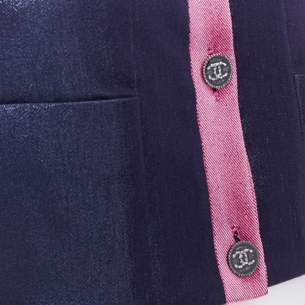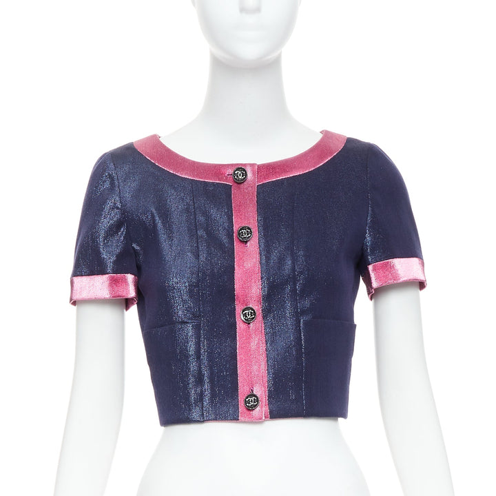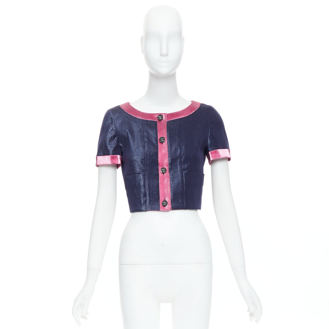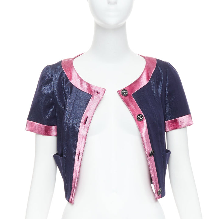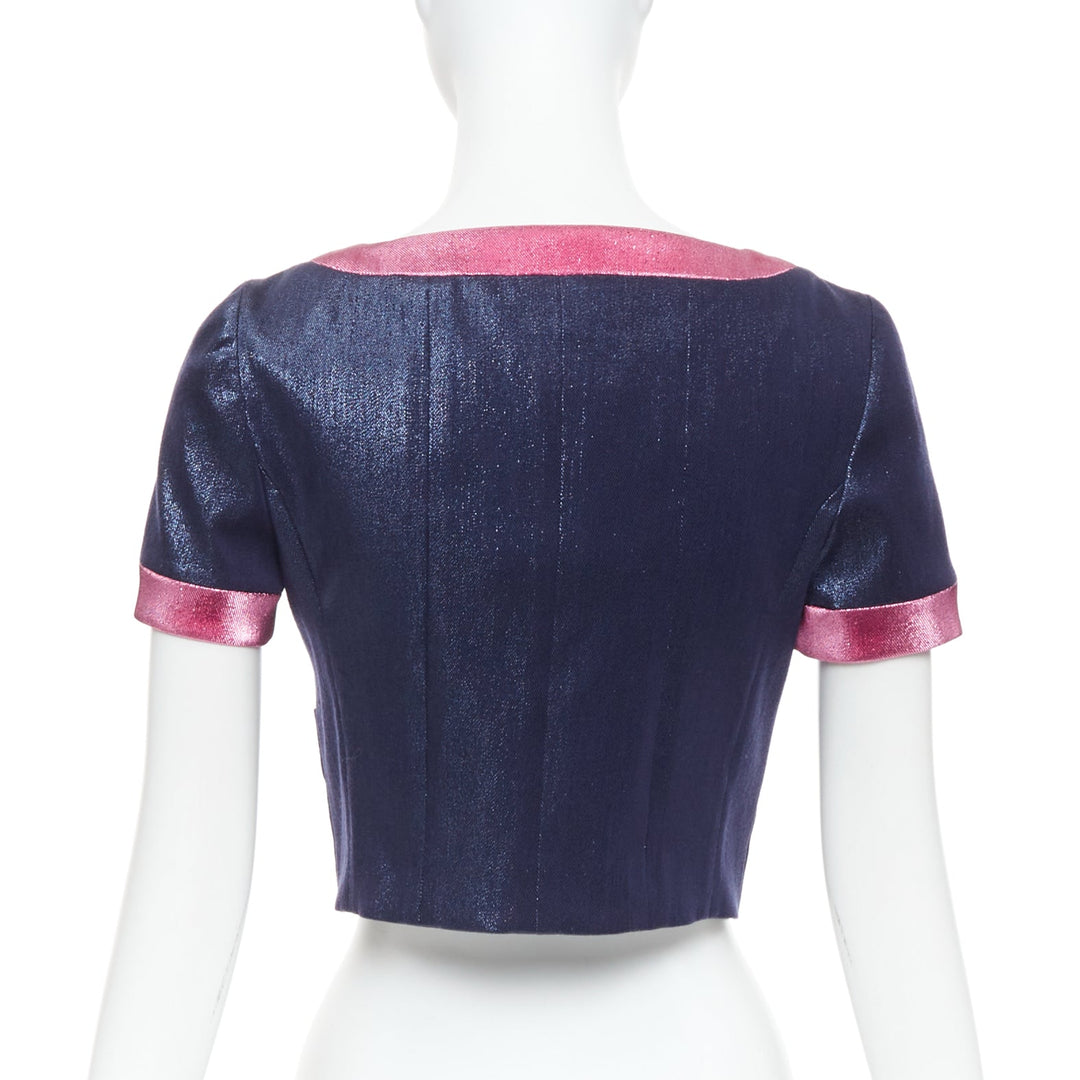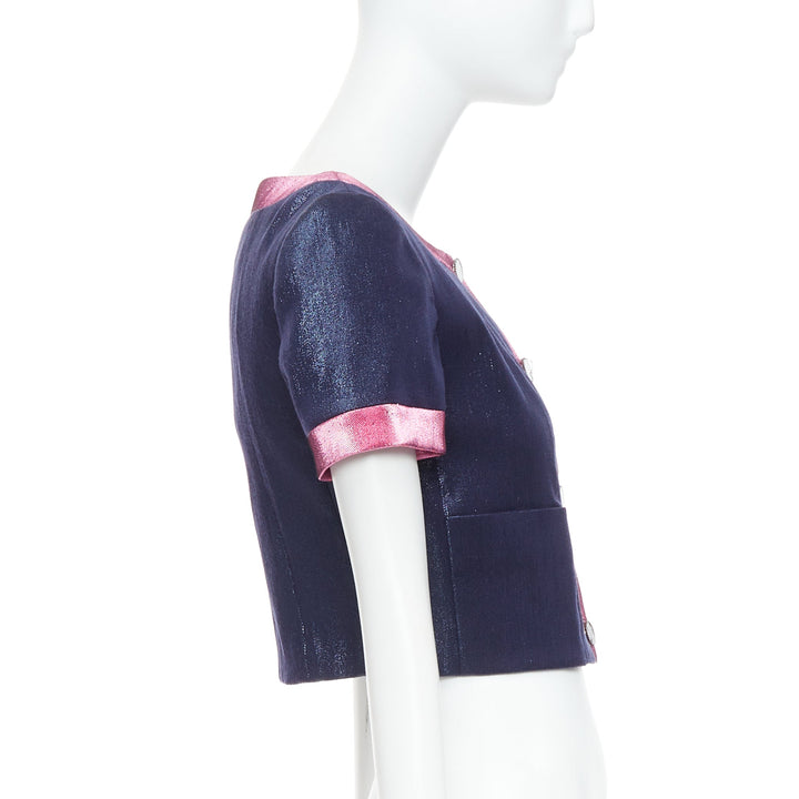 CHANEL 22K navy pink metallic wool blend cropped jacket FR36 S