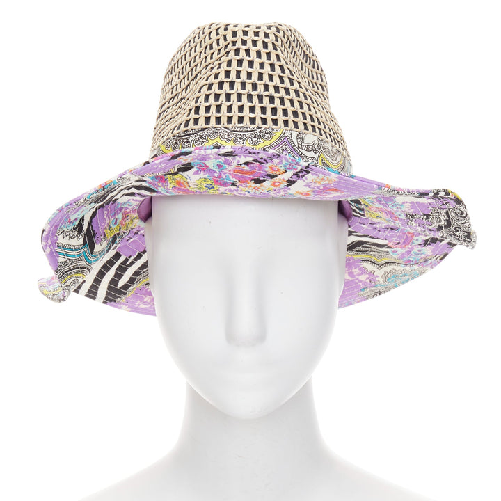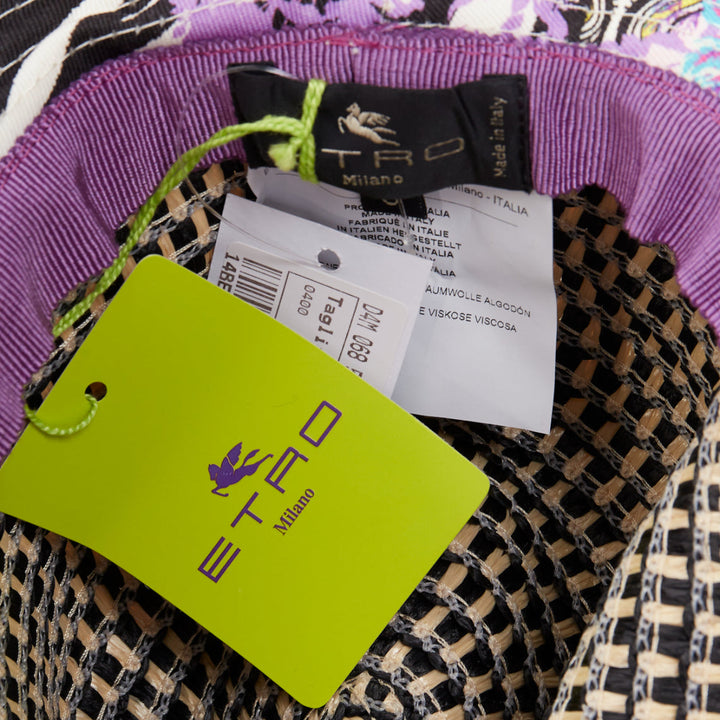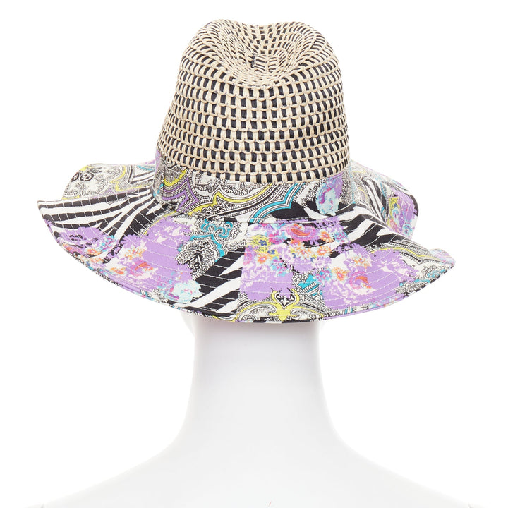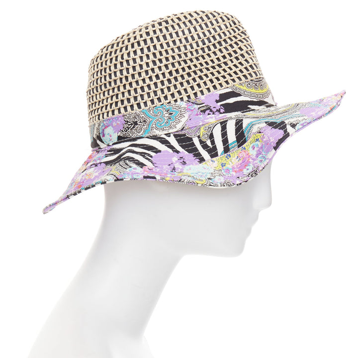 ETRO purple cotton blend paisley print beige raffia jute floppy hat S