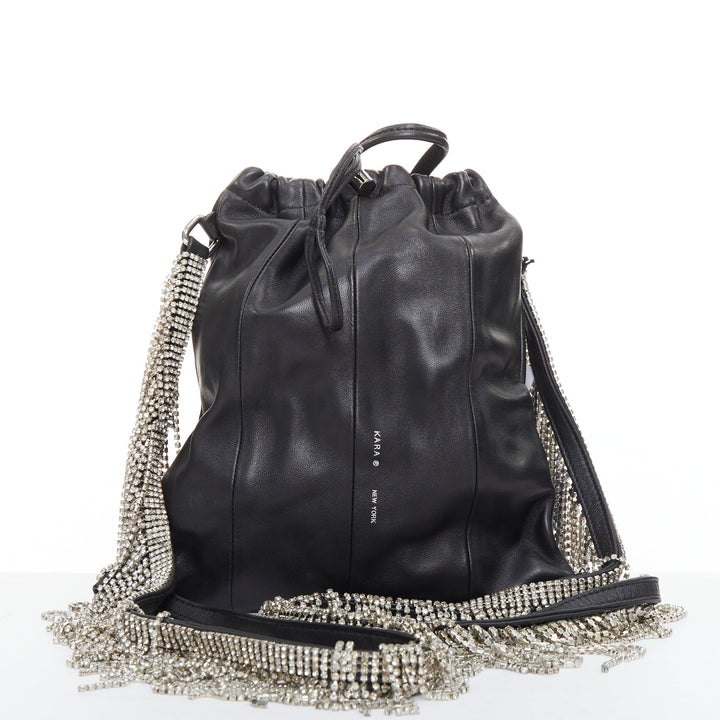 Extra Details: KARA blends classic glamour with contemporary streetwear in this backpack, adorned with sparkling strass fringes along both shoulder straps for a striking touch. Designed with a spacious main compartment and a drawstring closure, this leather carryall offers the perfect combination of style and functionality.