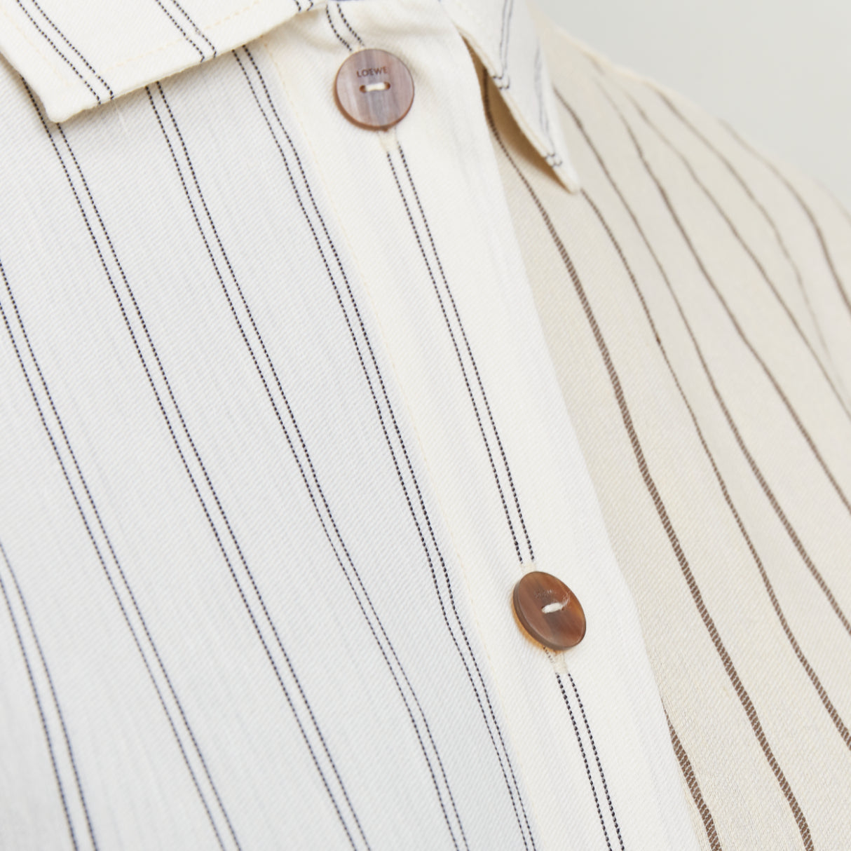 Extra Details: Loewe's shirt is a perfect interpretation of an artist's tunic, featuring pinstripes and a subtle tonal contrast on one side. It is significantly longer at the back and has a slim collar.