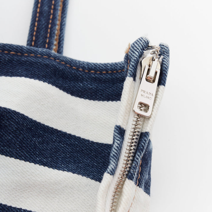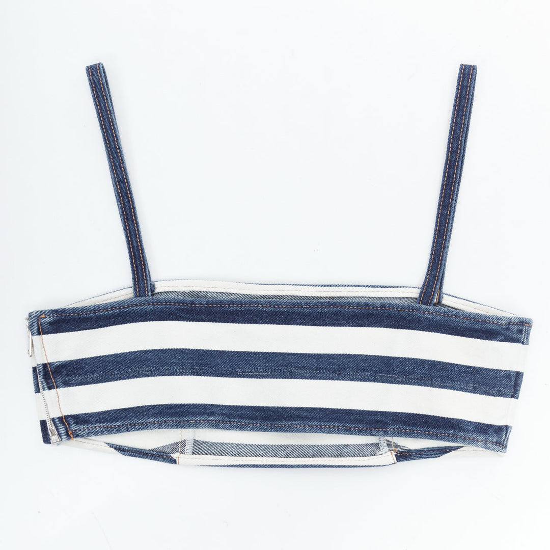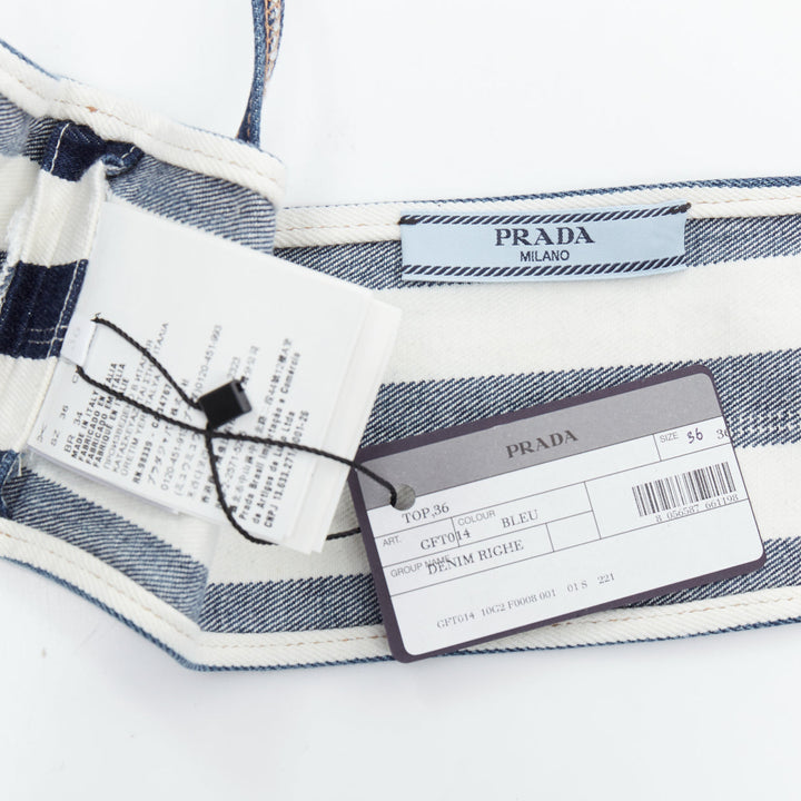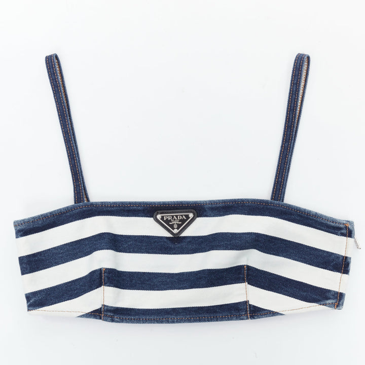 new PRADA blue white striped black triangle logo denim bustier bra IT36 XXS