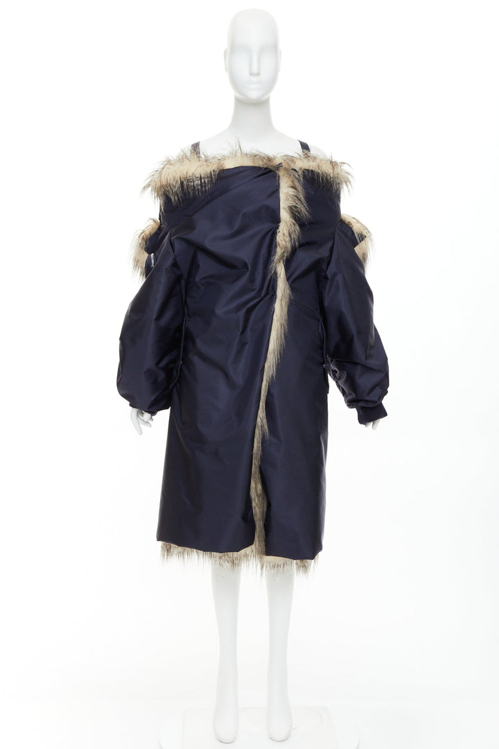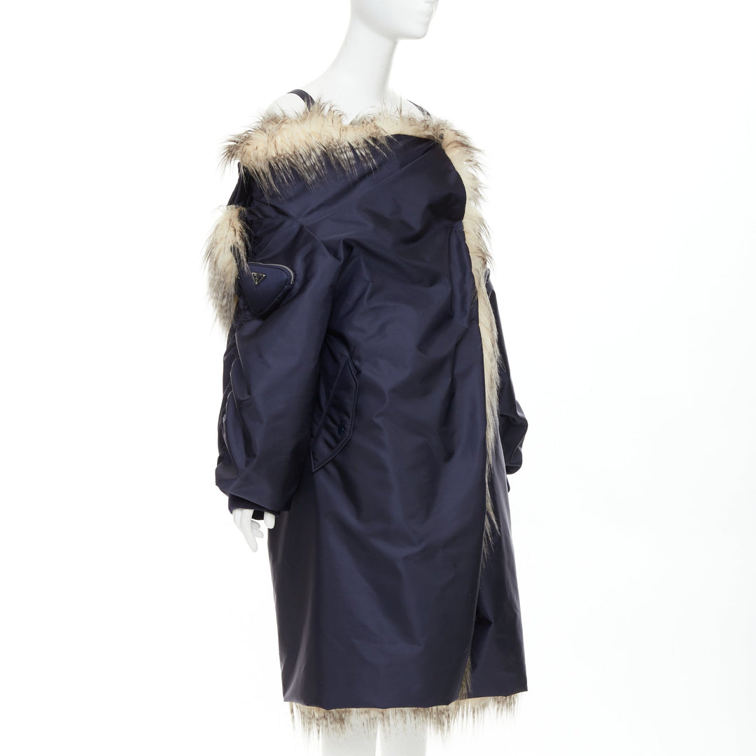 Extra Details: The Prada re-nylon coat features a faux fur lining made of modacrylic and acrylic, an enameled metal triangle logo, and an off-the-shoulder neckline with a removable hood. It has a concealed closure, long sleeves with ribbed cuffs, side flap pockets, and a patch pocket on the sleeve. The coat is oversized, mid-length, and made from a blend of modacrylic, polyester, and polyamide. Professional cleaning is recommended, and it is made in Italy.