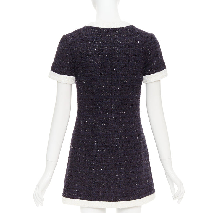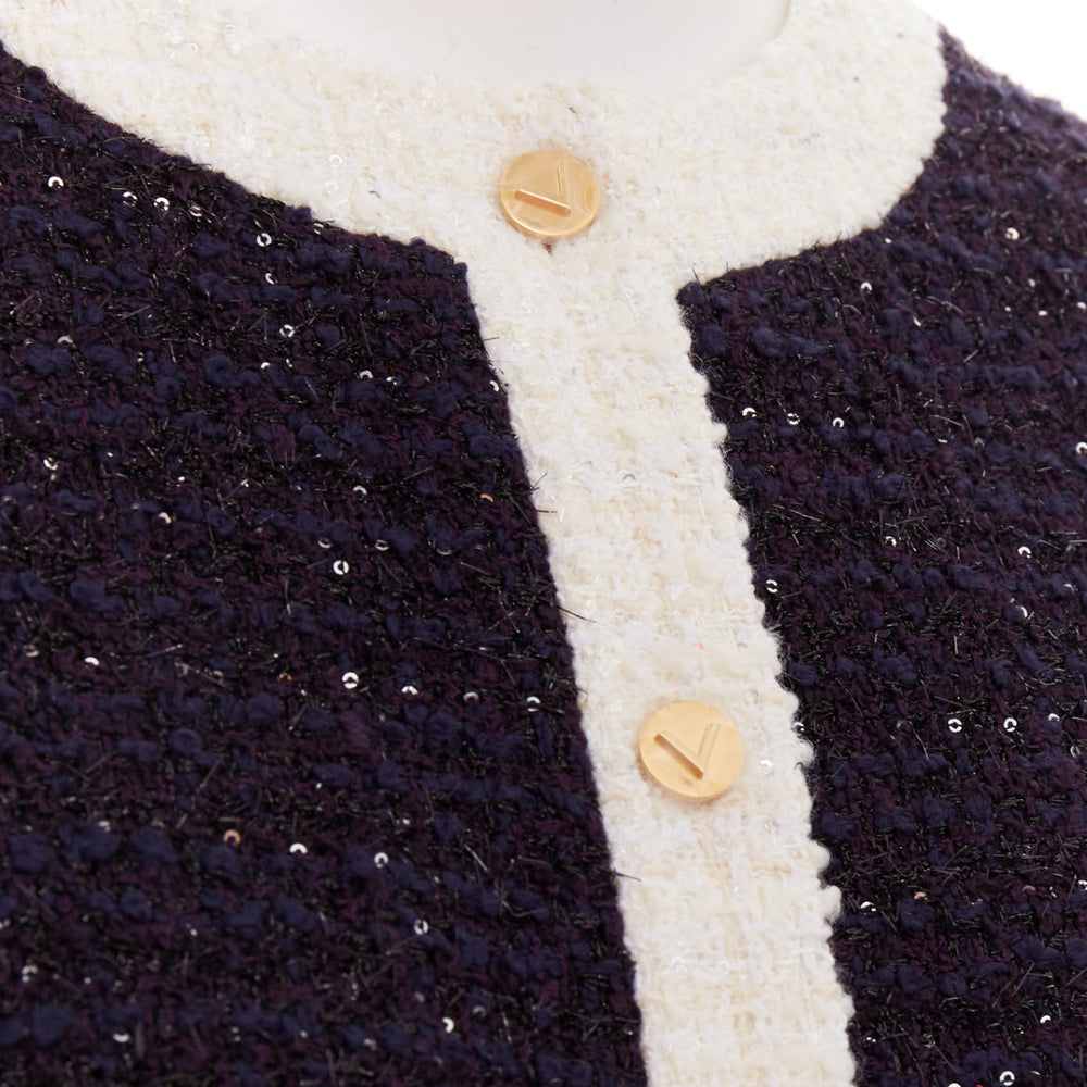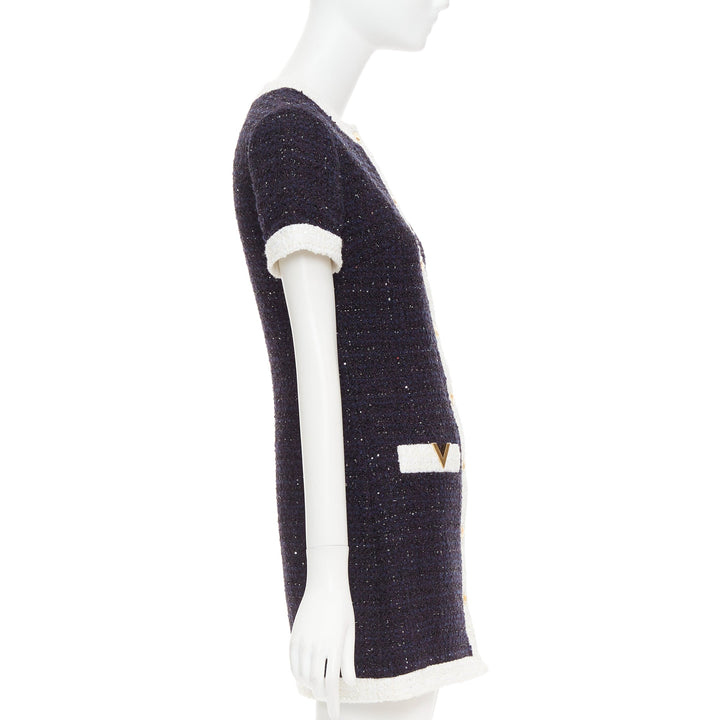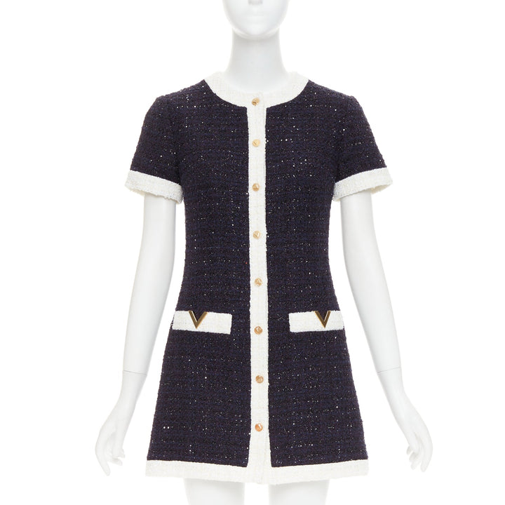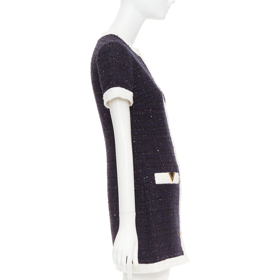 Extra Details: Valentino Garavani captures retro glamor with this mini dress, crafted in Italy from bouclé-tweed and adorned with shimmering sequins. White trims outline the short hem, while gold-tone V-embellished pockets add a sophisticated touch. Materials include 36% viscose, 22% cotton, 13% polyamide, 8% metallized fiber, and 5% wool, with secondary fabric composed of 29% cotton, 27% viscose, 25% polyamide, 14% acrylic, and 5% wool.
