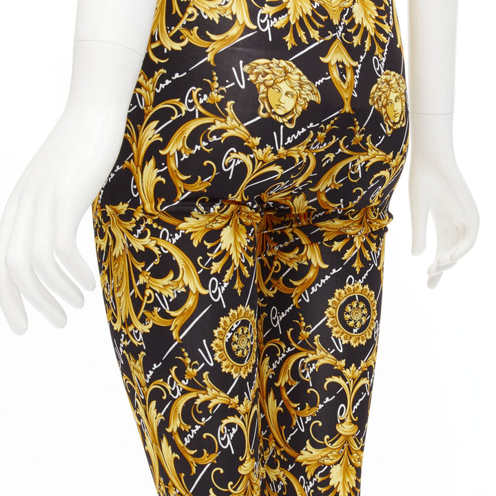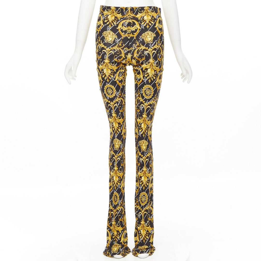 Extra Details: Stretch fit. Black with white Gianni signature print and gold Medusa Barocco print overlay. Flared pants.