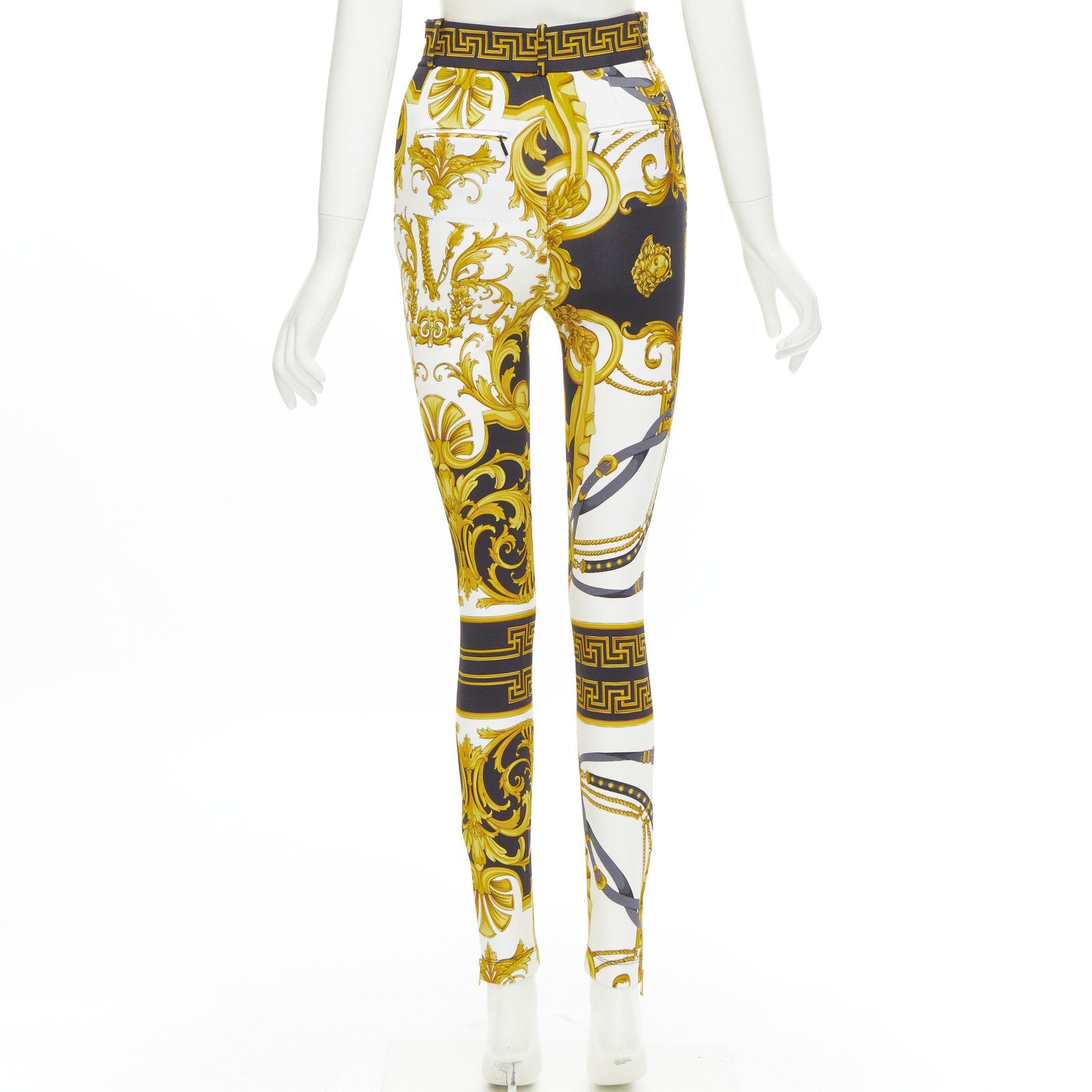 Extra Details: Signature Versace black and gold Barocco print mixed with Rodeo bondage straps. Black and gold Greca waist band with belt loop details, there is no stretch on waist band to hold waist in. Stretch-fit legs. Side zip closure. Dual zip back pockets. Zipper at cuff.