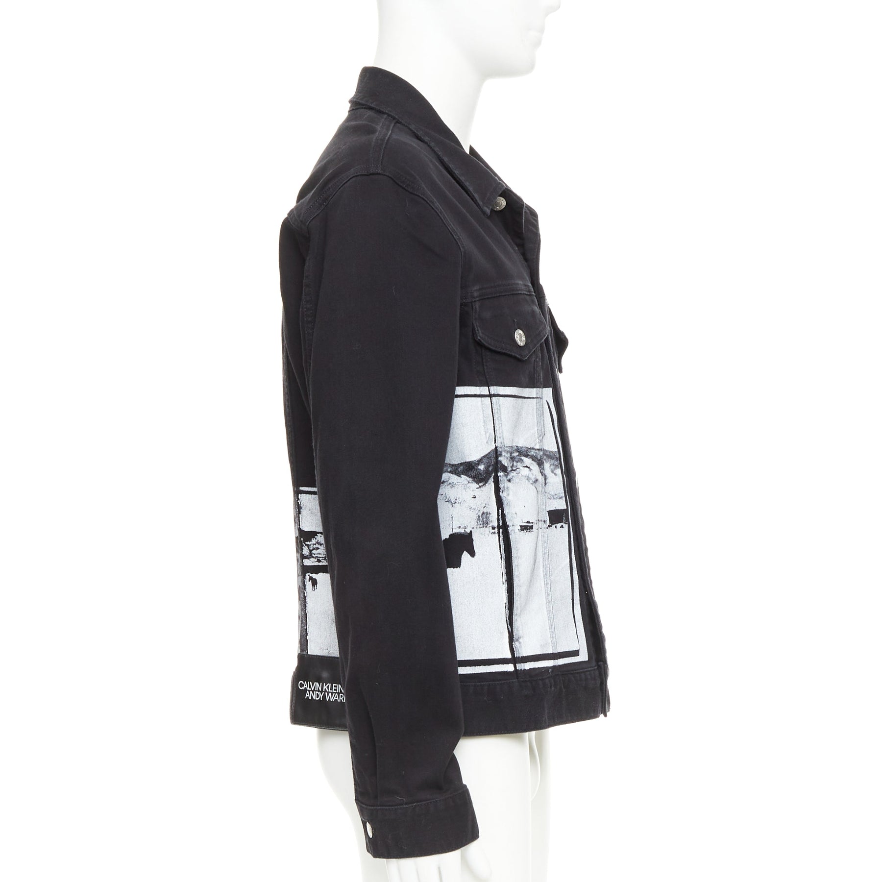 Extra Details: Regular fit. Flap pockets at the chest. Slit pockets at the waist. Branded metal buttons. Photo print on the front and back. Calvin Klein leather logo badge. Printed artwork features Andy Warhol's "Horses" from 1982.