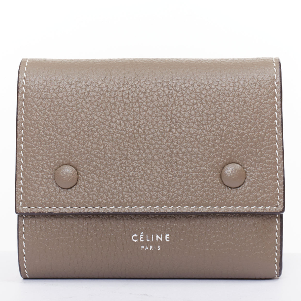 Extra Details: The CELINE Drummed Calfskin Small Multifunction Folded Wallet in Dune is crafted from fine-grained beige leather. It features a full frontal flap with two snaps, opening to a contrast yellow leather interior that includes two panels of card slots, a billfold, and a coin compartment.