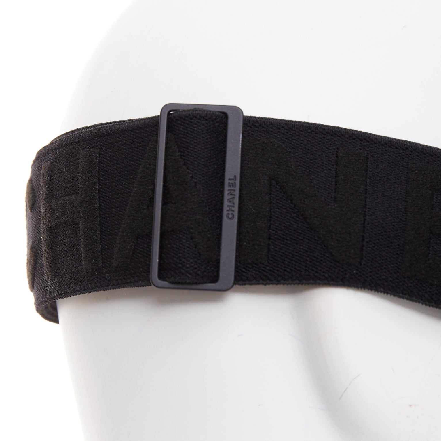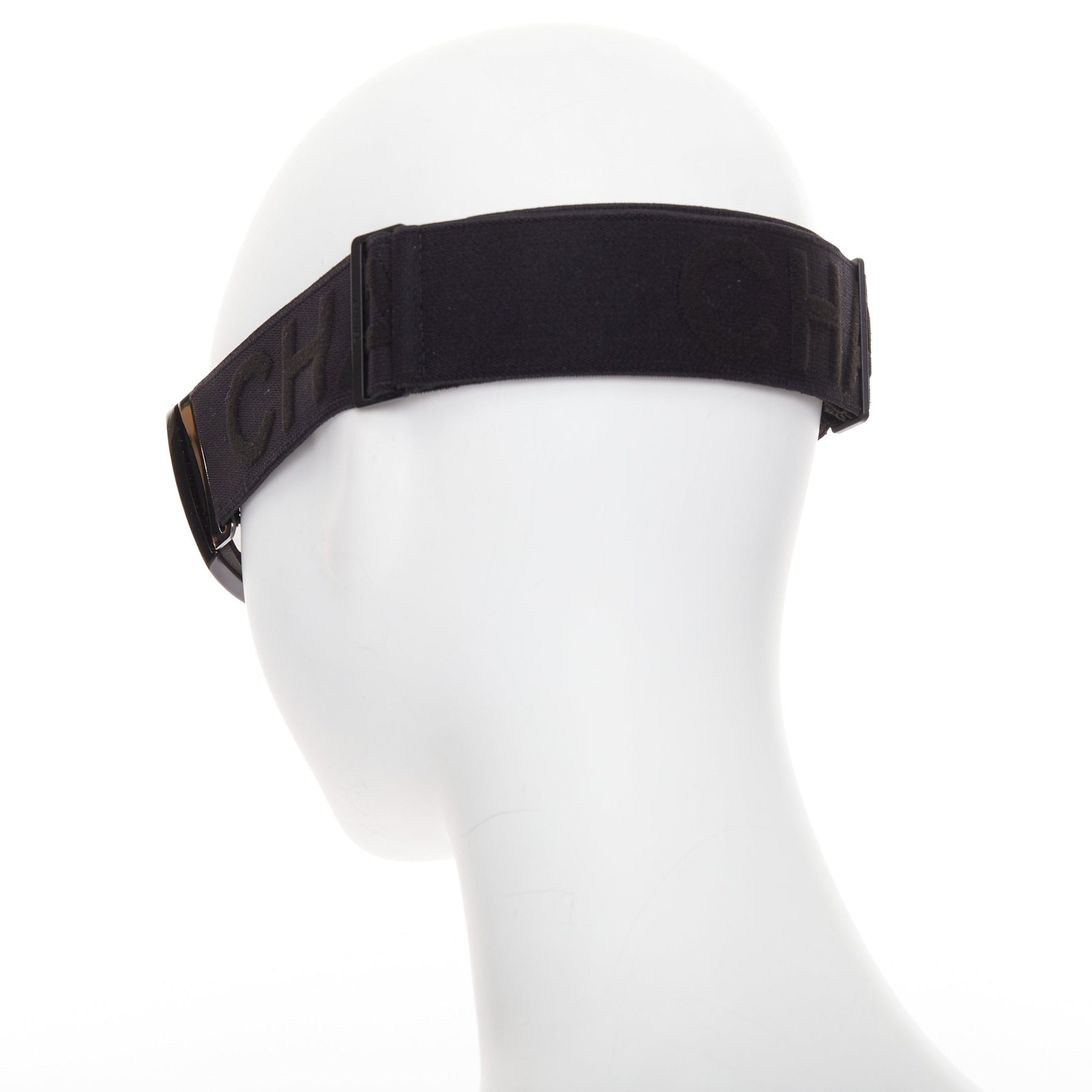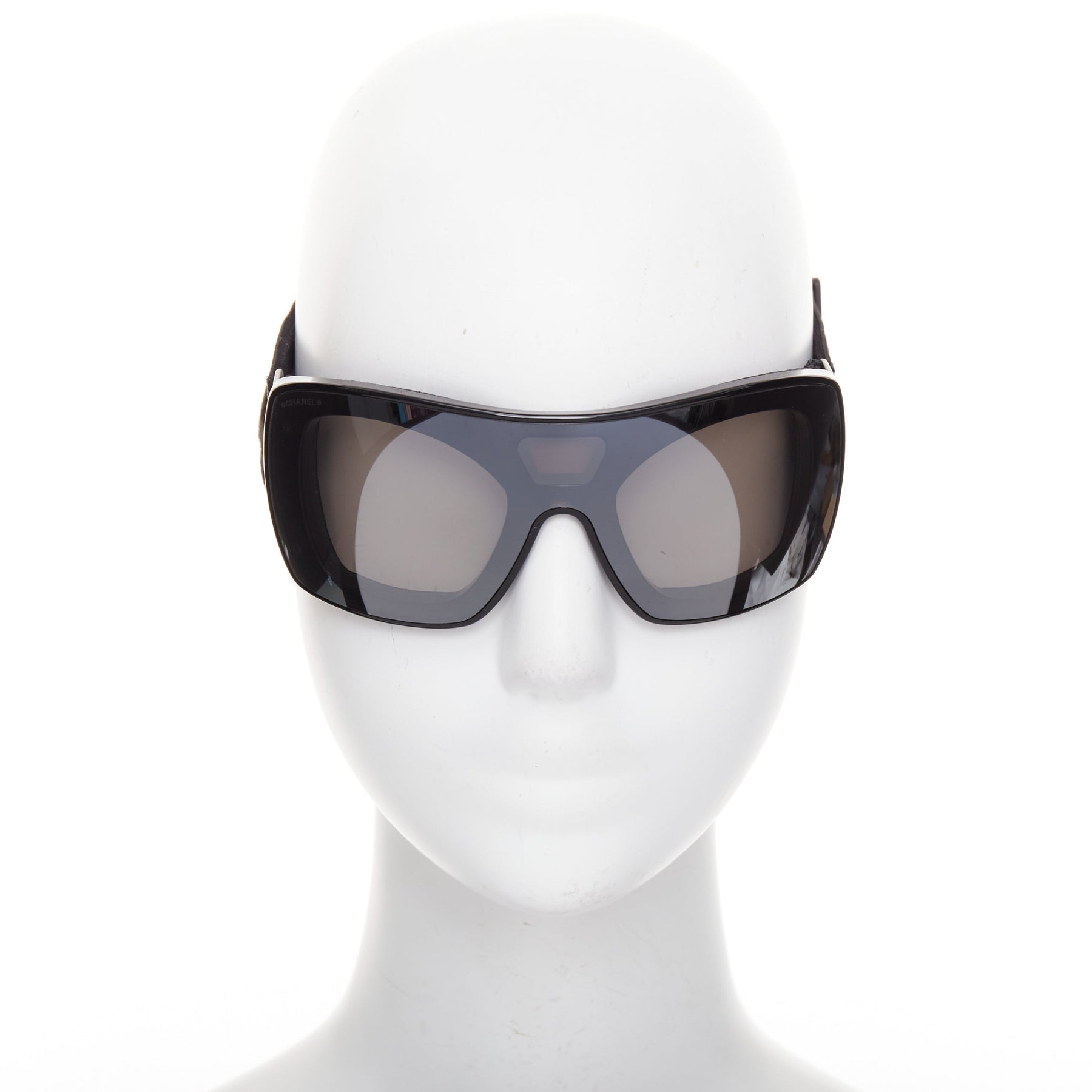 Extra Details: CHANEL Acetate Technical Satin Shield Sunglasses in Black. These stunning sunglasses are crafted of black acetate with mirrored dark lenses. This sunglasses also features an elastic band for a secure hold.