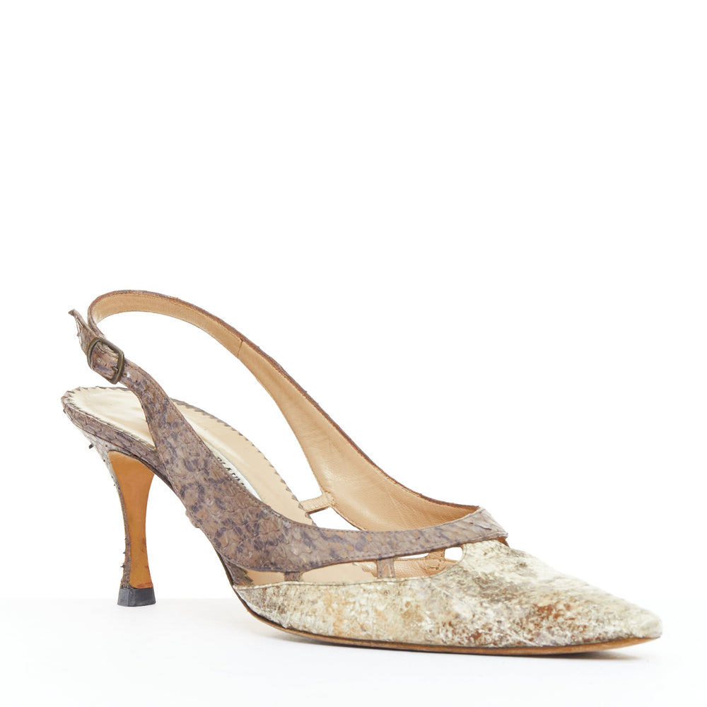 MANOLO BLAHNIK Vintage bicolor scaled leather pointy slingback kitten pumps EU39