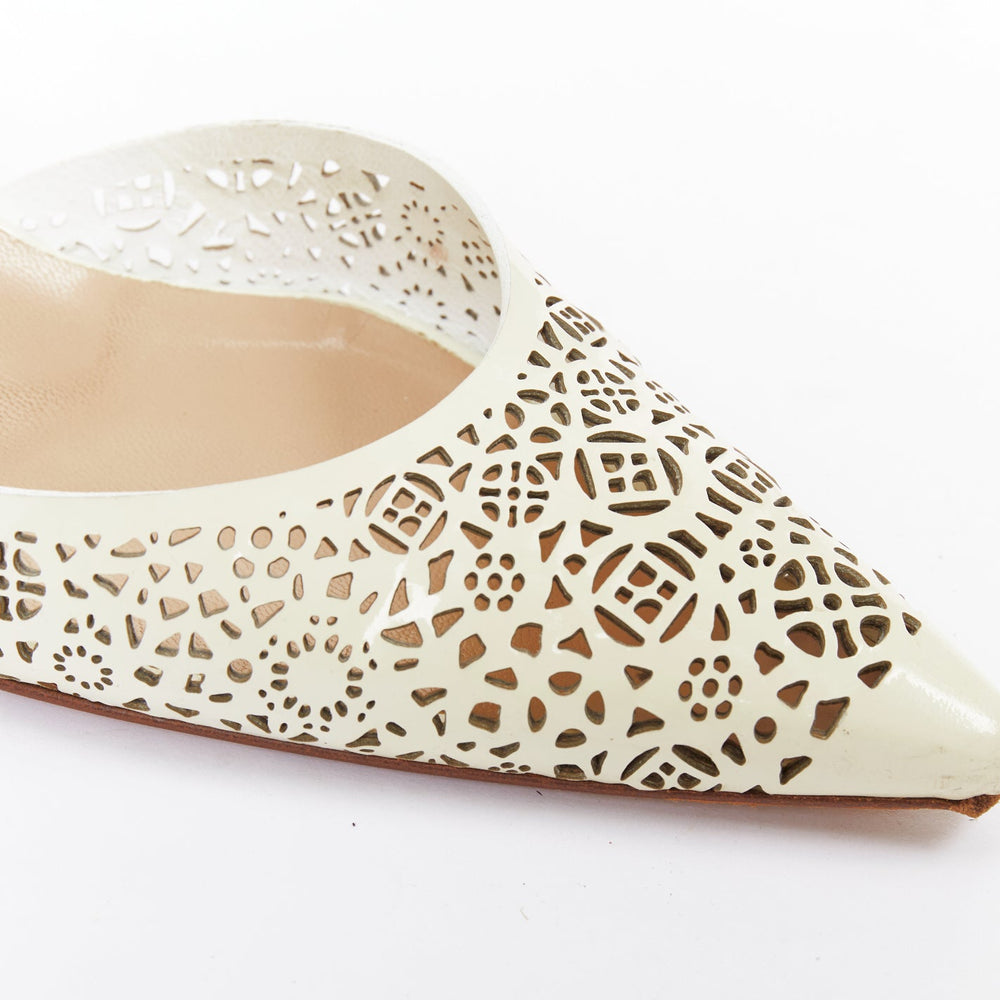 MANOLO BLAHNIK BB70 cream patent leather laser cut slingback kitten pump EU39